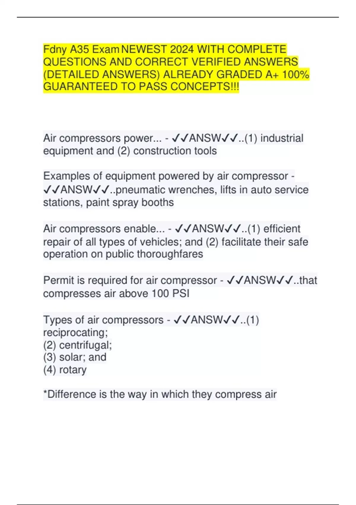 Fdny A35 Exam NEWEST 2024 WITH COMPLETE QUESTIONS AND CORRECT VERIFIED ANSWERS (DETAILED ANSWERS) ALREADY GRADED A+ 100% GUARANTEED TO PASS CONCEPTS!!! Air compressors power... - ANSW..(1) industrial equipment and (2) construction tools