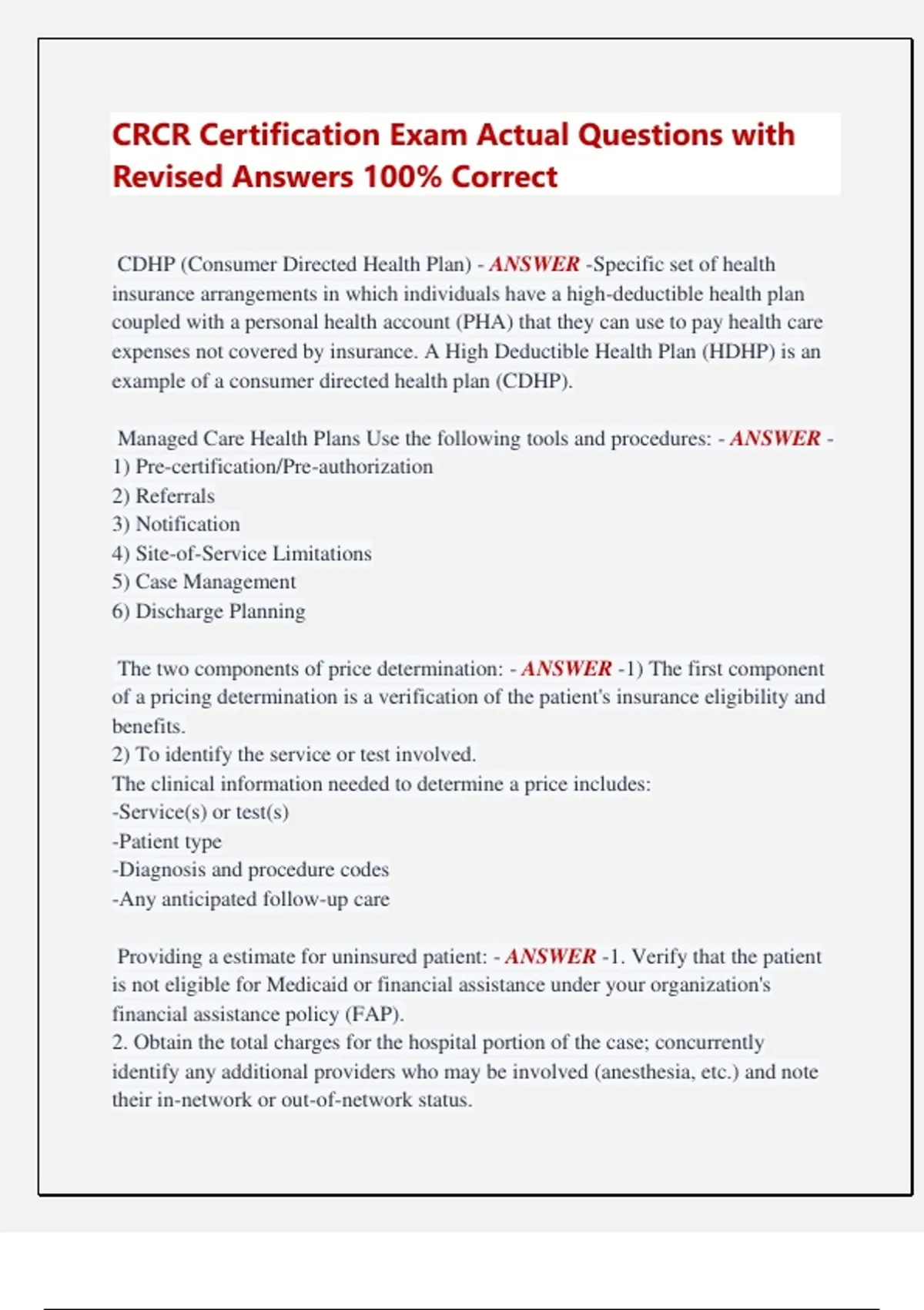 CDHP (Consumer Directed Health Plan) - ANSWER -Specific set of health