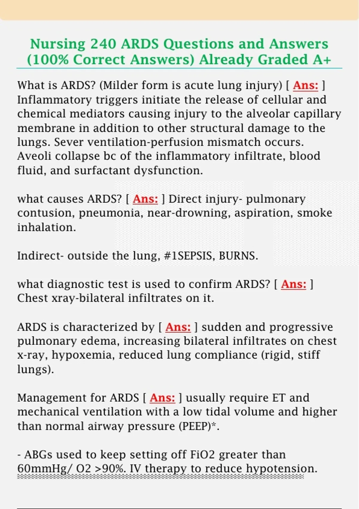 Nursing 240 ARDS Questions and Answers (100% Correct Answers) Already Graded A+