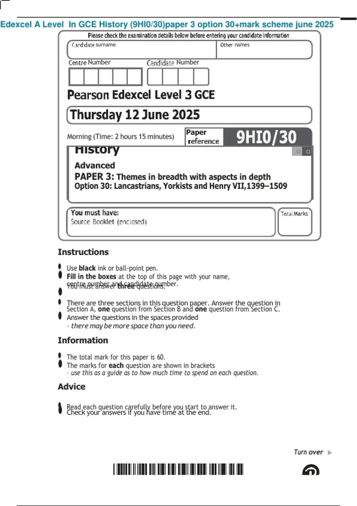 Option 30: Lancastrians, Yorkists and Henry VII,1399–1509