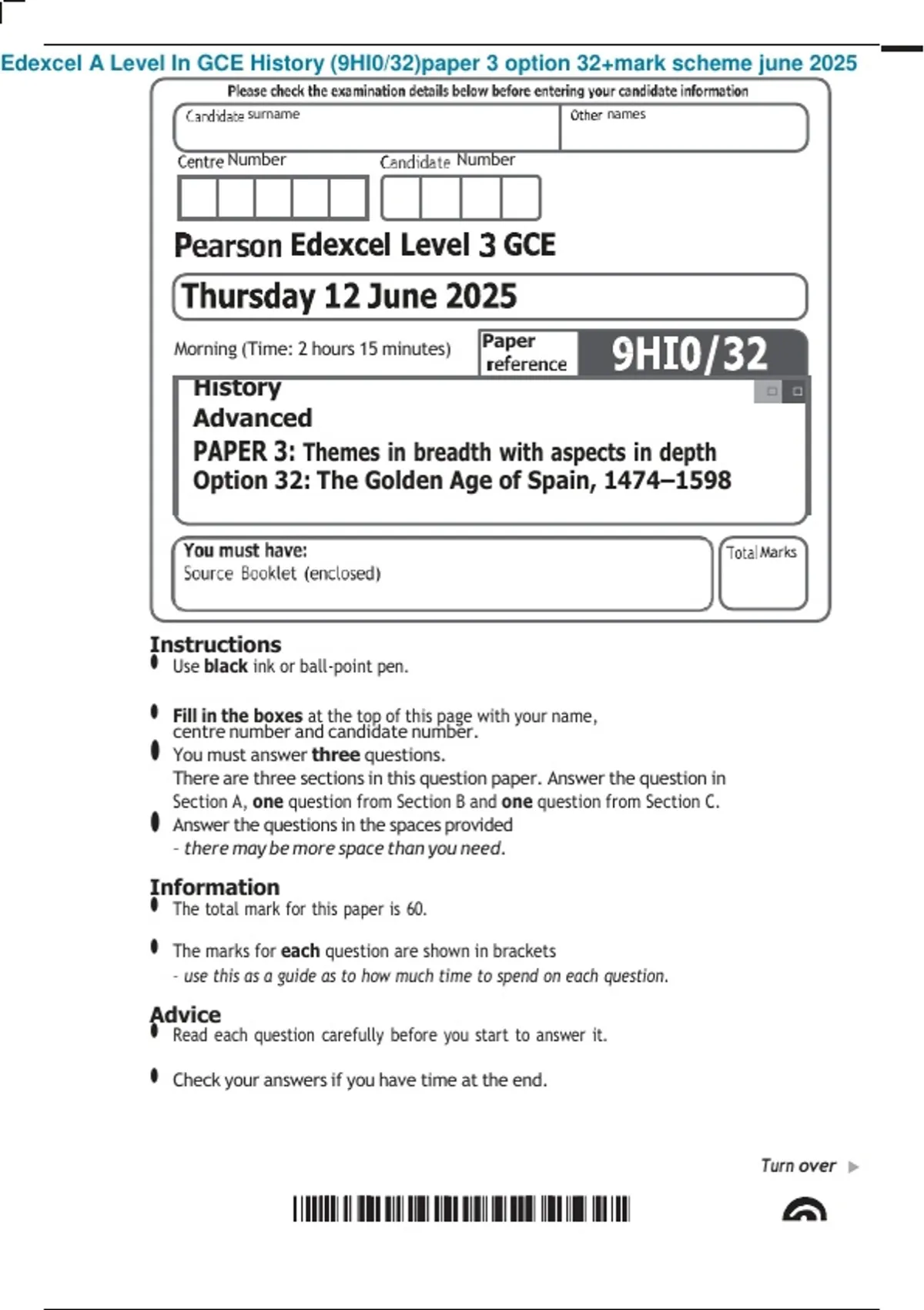 Edexcel A Level In GCE History (9HI0/32)paper 3 option 32+mark scheme june 2025