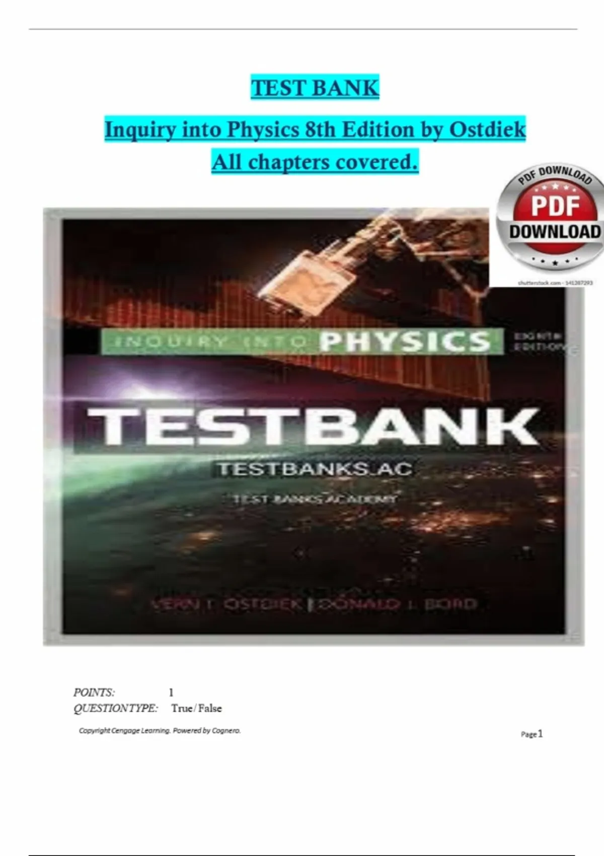 TEST BANK For Inquiry into Physics 8th Edition by Ostdiek.|All chapters 1-12 included, Graded A+.