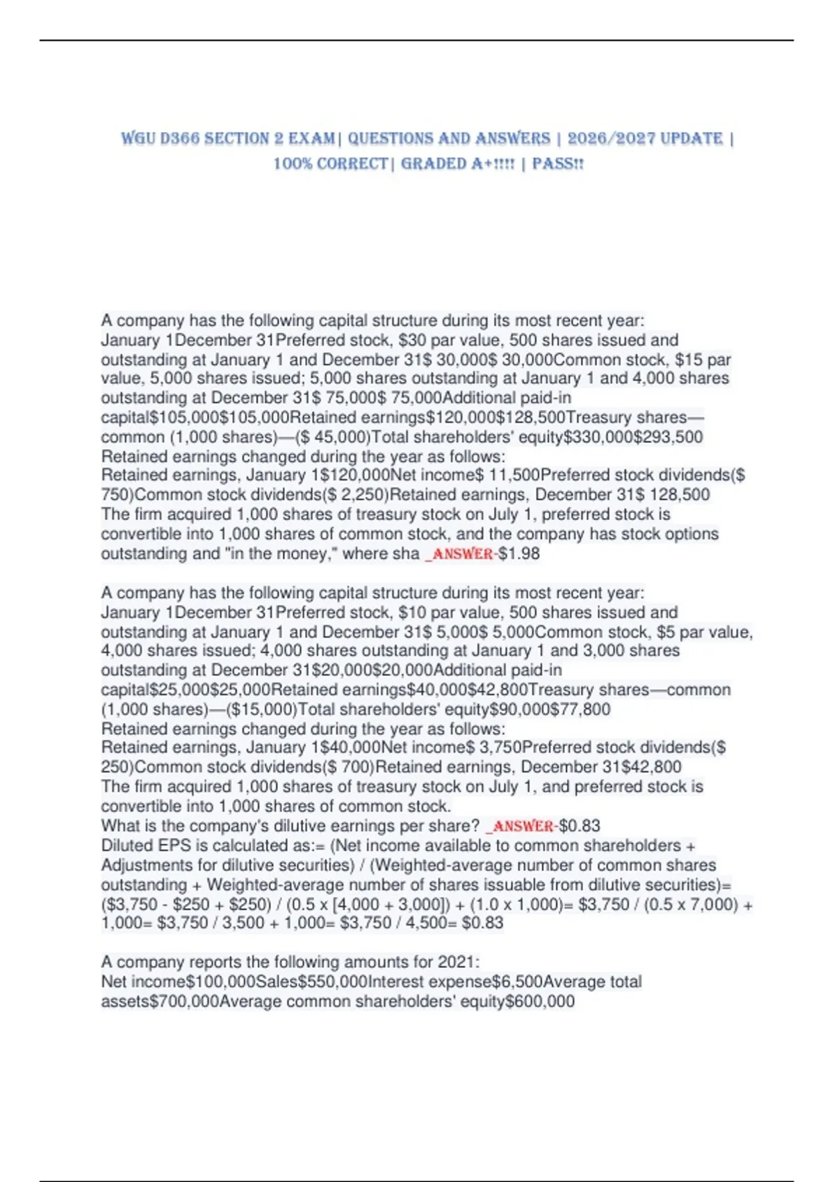 The company did not have preferred stock outstanding, and its tax rate is 30%.