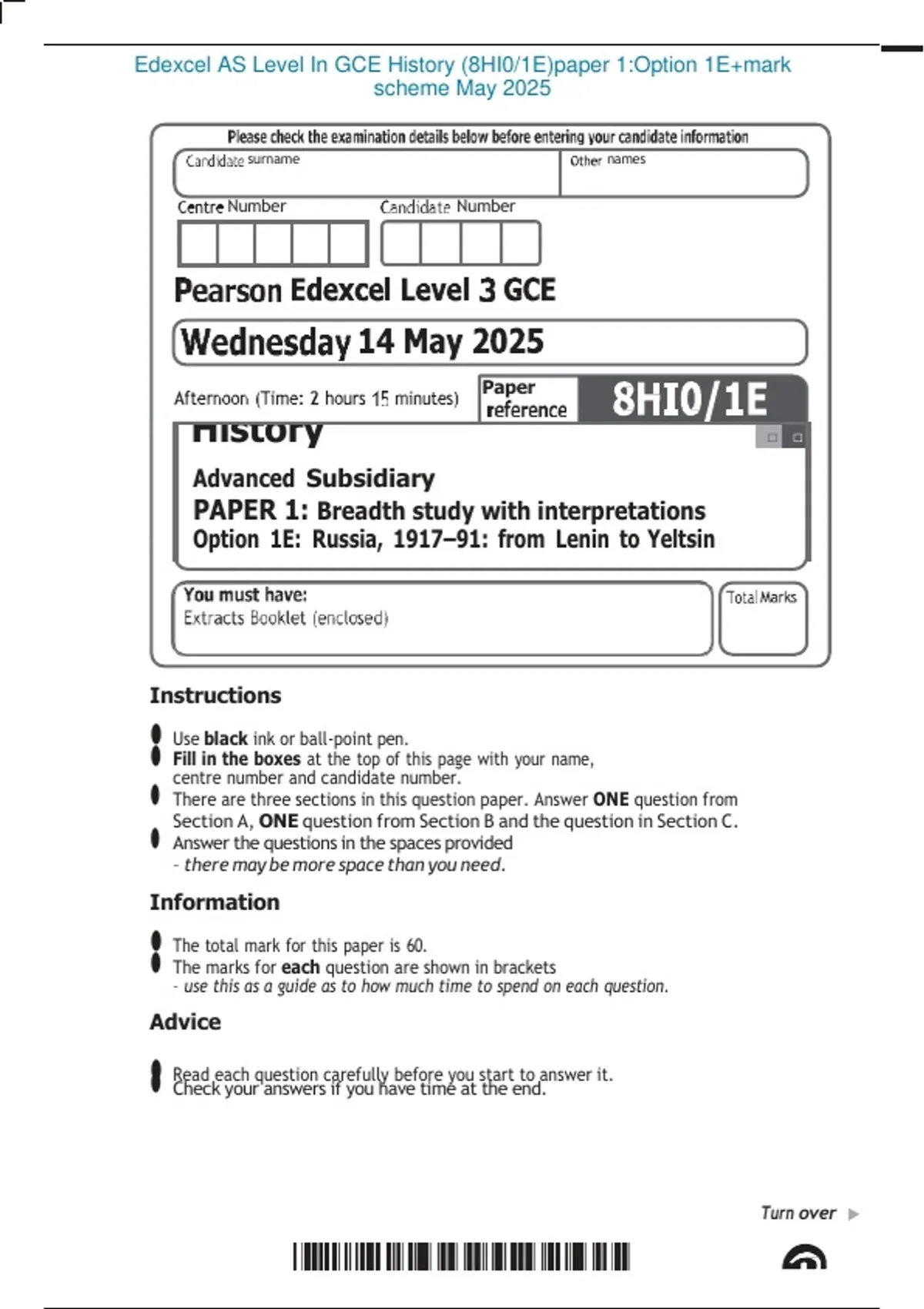 Edexcel AS Level In GCE History (8HI0/1E)paper 1:Option 1E+mark scheme May 2025
