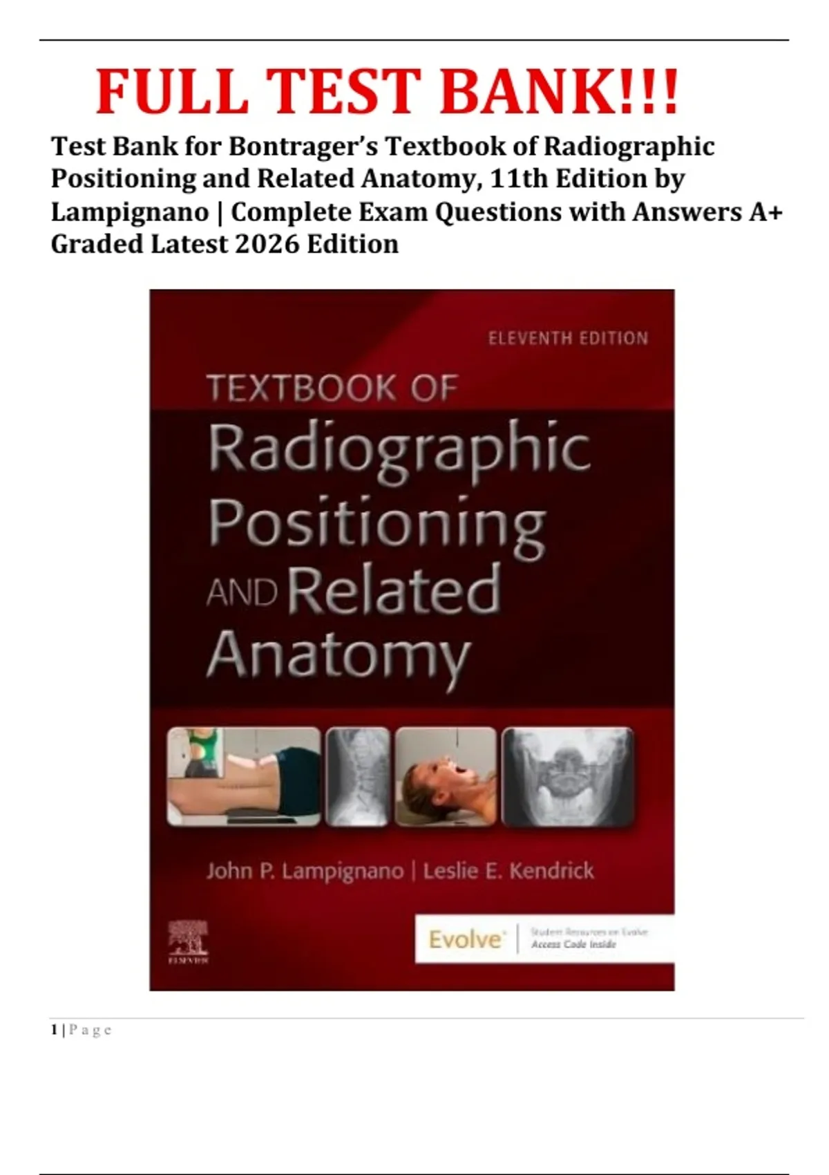 Test Bank for Bontrager’s Textbook of Radiographic Positioning and Related Anatomy, 11th Edition by Lampignano | Complete Exam Questions with Answers A+ Graded Latest 2026 Edition