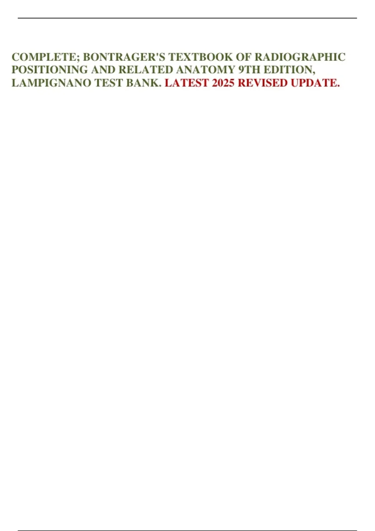 COMPLETE; BONTRAGER'S TEXTBOOK OF RADIOGRAPHIC POSITIONING AND RELATED ANATOMY 9TH EDITION, LAMPIGNANO TEST BANK. LATEST 2025 REVISED UPDATE.