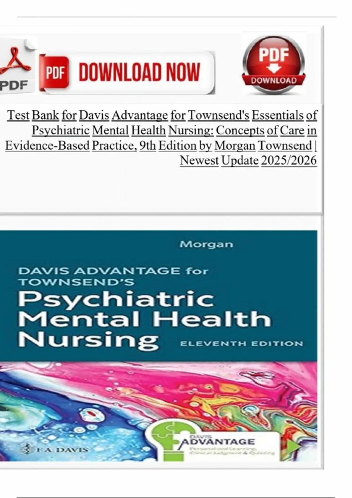 Test Bank for Davis Advantage for Townsend's Essentials of Psychiatric Mental Health Nursing: Concepts of Care in Evidence-Based Practice, 9th Edition by Morgan Townsend | Newest Update including Rationales.