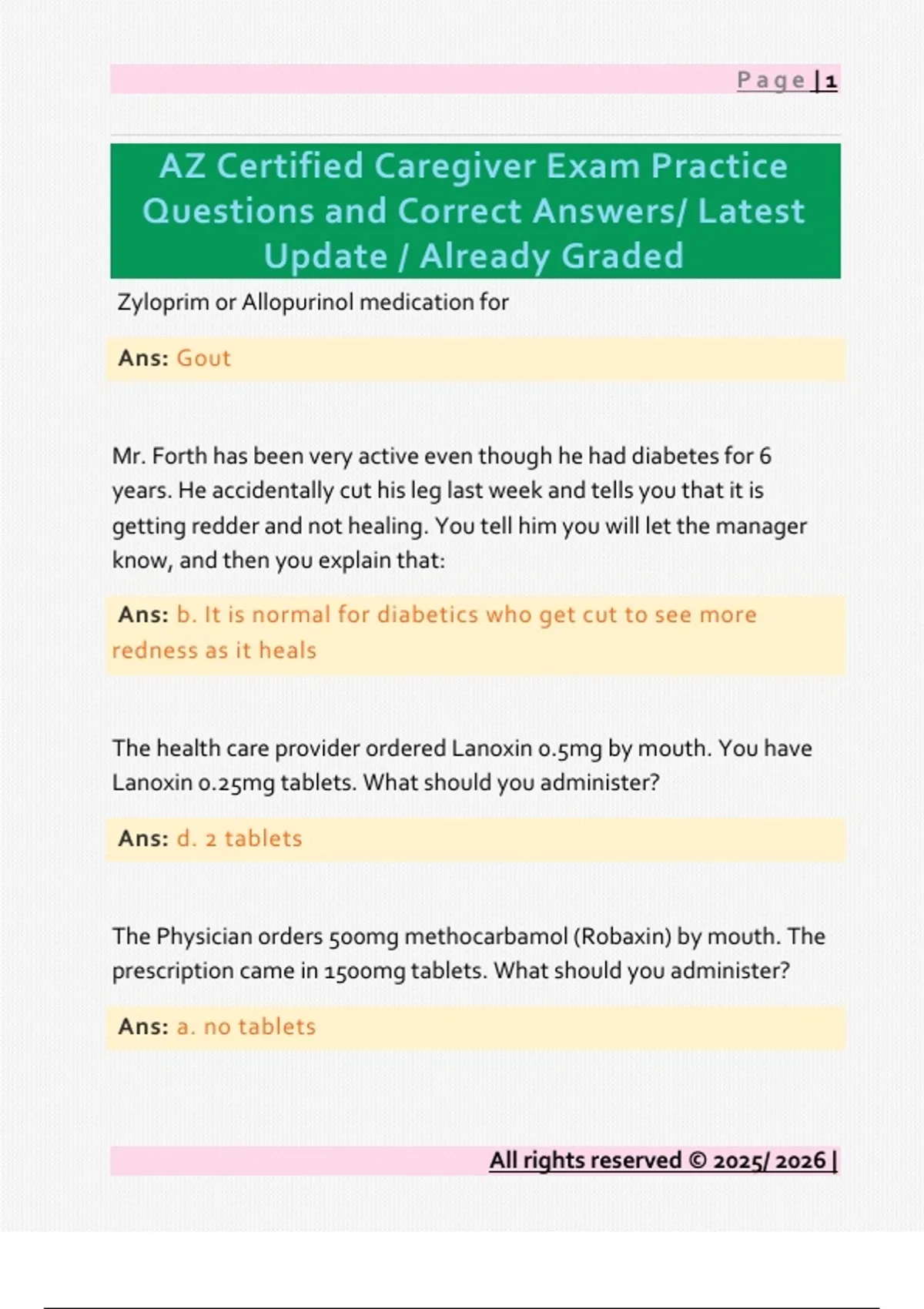 Zyloprim or Allopurinol medication for Ans: Gout Mr. Forth has been very active even though he had diabetes for 6 years. He accidentally cut his leg last week and tells you that it is getting redder and not healing. You tell him you will let the manager know, and then you explain that: Ans: b. It is normal for diabetics who get cut to see more redness as it heals The health care provider ordered Lanoxin 0.5mg by mouth. You have Lanoxin 0.25mg tablets. What should you administer? Ans: d. 2 tablets The Physician orders 500mg methocarbamol (Robaxin) by mouth. The prescription came in 1500mg tablets. What should you administer? Ans: a. no tablets All rights reserved © 2025/ 2026 | Page | 2 Nitrofurantoin is another name for furadantine and is an antibiotic to treat Ans: d. urinary tract infection Which of the following will best protects you from sharps exposure? Ans: a. Never recap used needles or lancets ______________________ is defined as a substantial psychological, social, and occupational disability in which an individual experiences a significant change in usual functioning. Ans: a. Dysthymia The individual who responds best to oral hypoglycemic medication is Ans: a. over 40 years of age and has had diabetes more than 5 years The proper way to dispose of a tablet that has fallen on the floor in an individual's room is Ans: c. Follow the facility policy that is in place for contaminated medications All rights reserved © 2025/ 2026 | Page | 3 When giving a rectal suppository, place the Ans: c. Individual on their left side with their upper knee flexed. A disease characterized by a decreased blood flow to the heart, due to arteries narrowed by accumulated cholesterol and lipids, is known as Ans: d. Coronary Artery Disease Mr. Lincoln has an order for Xanax 0.25mg by mouth at bedtime. He asks that it be administered every morning with his breakfast, this is an