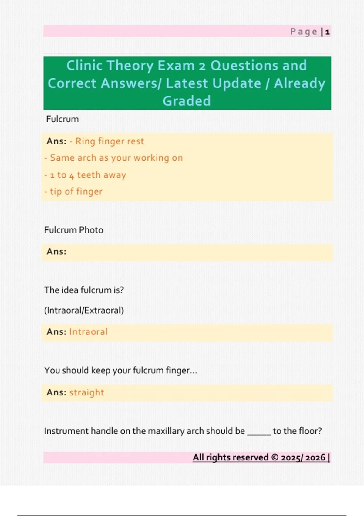 Fulcrum Ans: - Ring finger rest - Same arch as your working on - 1 to 4 teeth away - tip of finger Fulcrum Photo Ans: The idea fulcrum is? (Intraoral/Extraoral) Ans: Intraoral You should keep your fulcrum finger... Ans: straight Instrument handle on the maxillary arch should be _____ to the floor? Page | 2 Ans: parallel Instrument handle on the mandibular arch should be _______ to the floor. Ans: perpendicular The terminal shank of an instrument should be________ to the mesial/distal surfaces (long axis of the tooth). Ans: parallel What are the three steps to check for a correct working end? Ans: - Terminal shank parallel to long axis of the tooth. - V to the D - Curve of working end curves to the medial of posterior teeth. Which end of EXD 11/12 do you use on the Mesiolingual of #20? Ans: Which end of EXD 11/12 do you use on the Distolingual of #20? Ans: All rights reserved © 2025/ 2026 | Page | 3 Which end of EXD 11/12 do you use on the mesiofacial of #3? Ans: