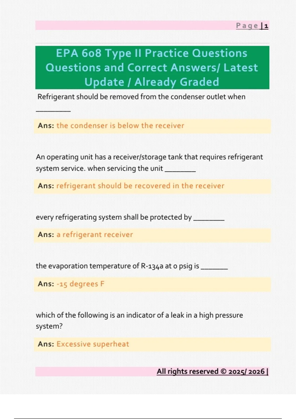 EPA 608 Type II Practice Questions Questions and Correct Answers/ Latest Update / Already Graded