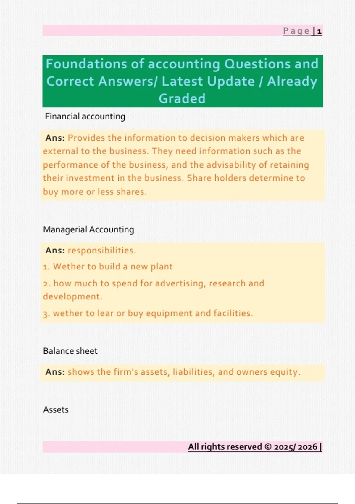 Foundations of accounting Questions and Correct Answers/ Latest Update / Already Graded
