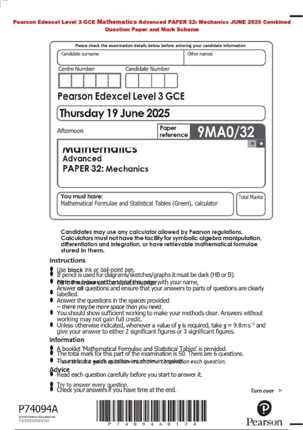 Pearson Edexcel Level 3 GCE Mathematics Advanced PAPER 32: Mechanics JUNE 2025 Combined Question Paper and Mark Scheme