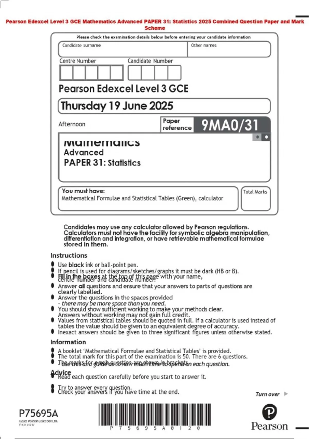 Pearson Edexcel Level 3 GCE Mathematics Advanced PAPER 31: Statistics 2025 Combined Question Paper and Mark Scheme