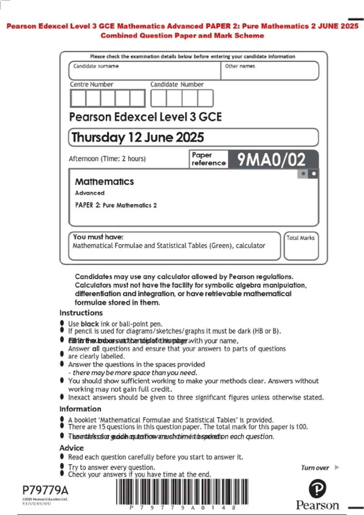 Pearson Edexcel Level 3 GCE Mathematics Advanced PAPER 2: Pure Mathematics 2 JUNE 2025 Combined Question Paper and Mark Scheme