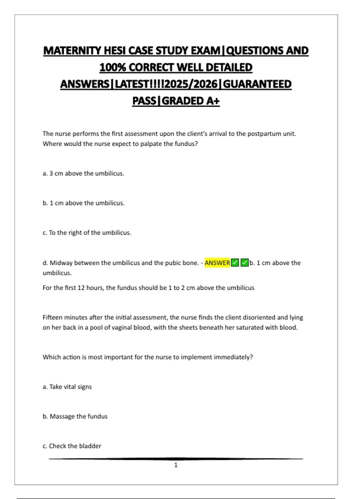 fundus is the most important intervention. The nurse should also call for assistance due to
