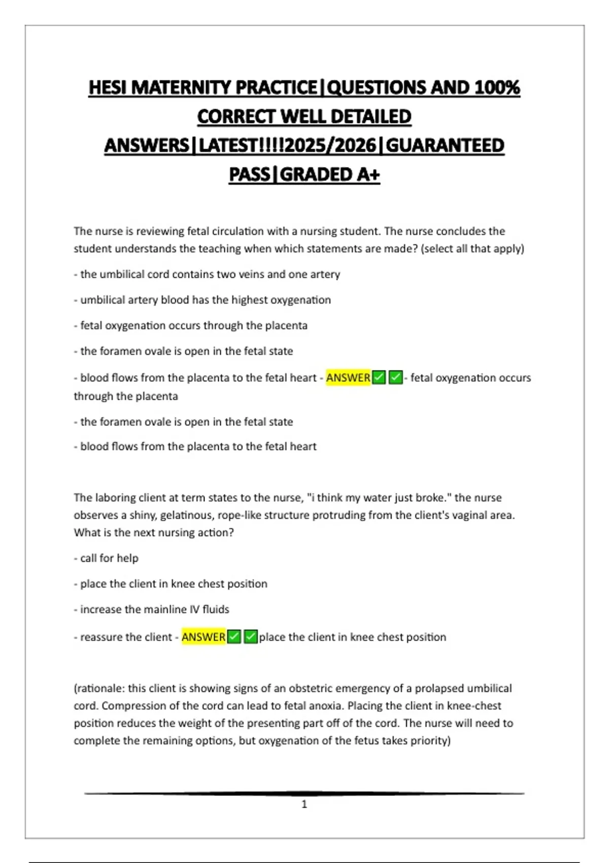 (rationale: this client is showing signs of an obstetric emergency of a prolapsed umbilical