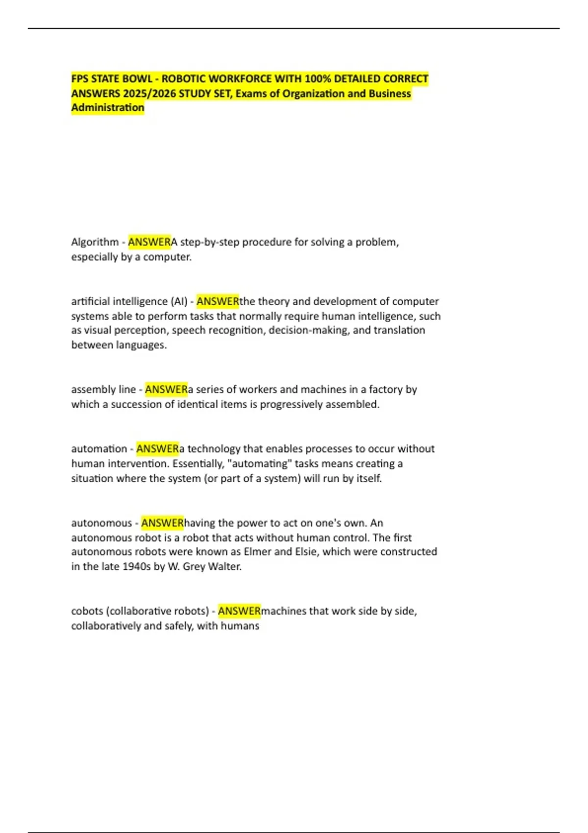 ANSWERS 2025/2026 STUDY SET, Exams of Organization and Business