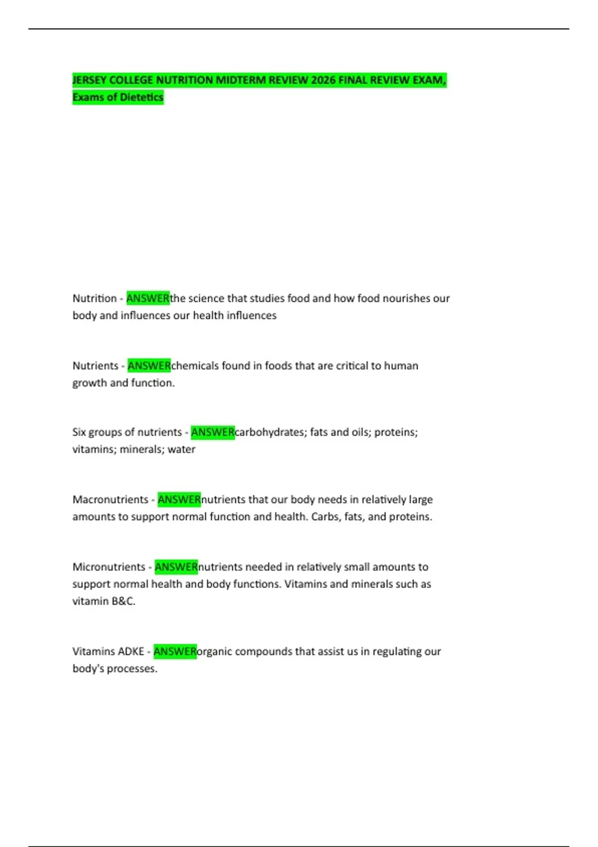 JERSEY COLLEGE NUTRITION MIDTERM REVIEW 2026 FINAL REVIEW EXAM,