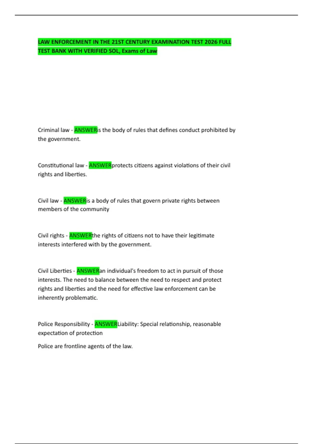 LAW ENFORCEMENT IN THE 21ST CENTURY EXAMINATION TEST 2026 FULL TEST BANK WITH VERIFIED SOL, Exams of Law