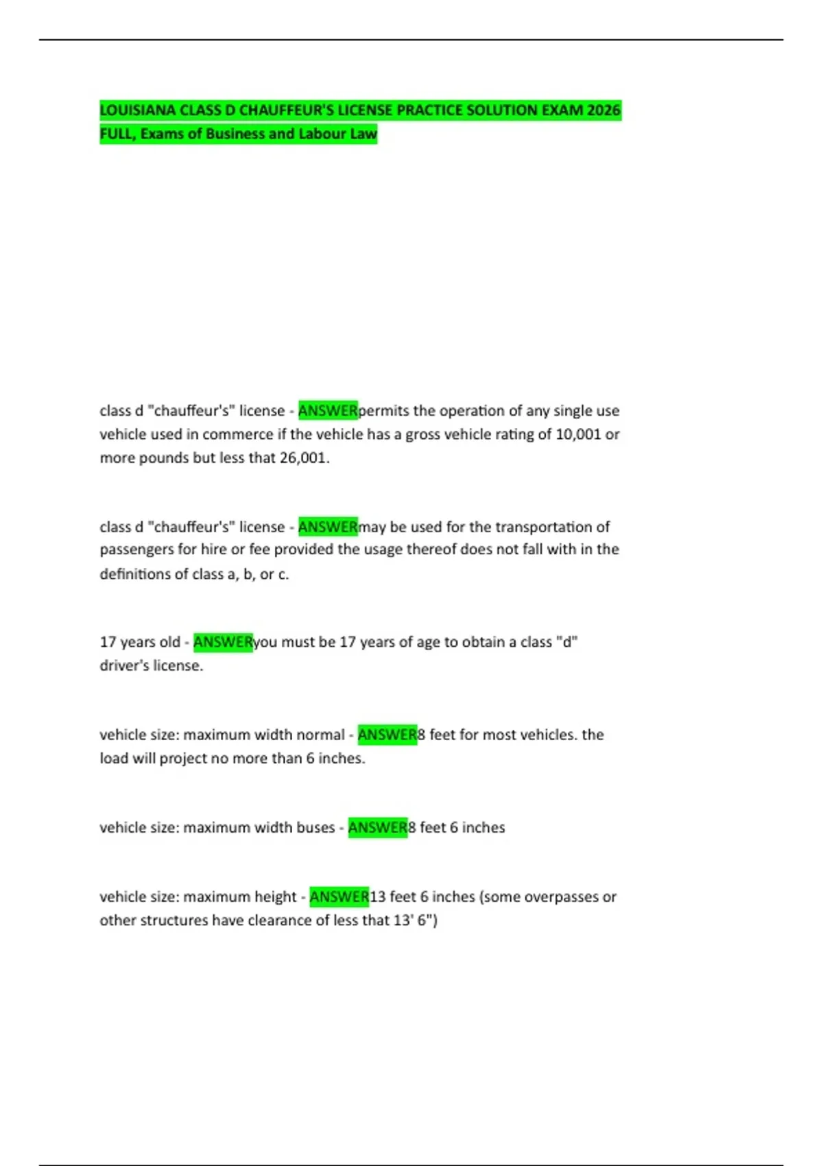 LOUISIANA CLASS D CHAUFFEUR'S LICENSE PRACTICE SOLUTION EXAM 2026 FULL, Exams of Business and Labour Law