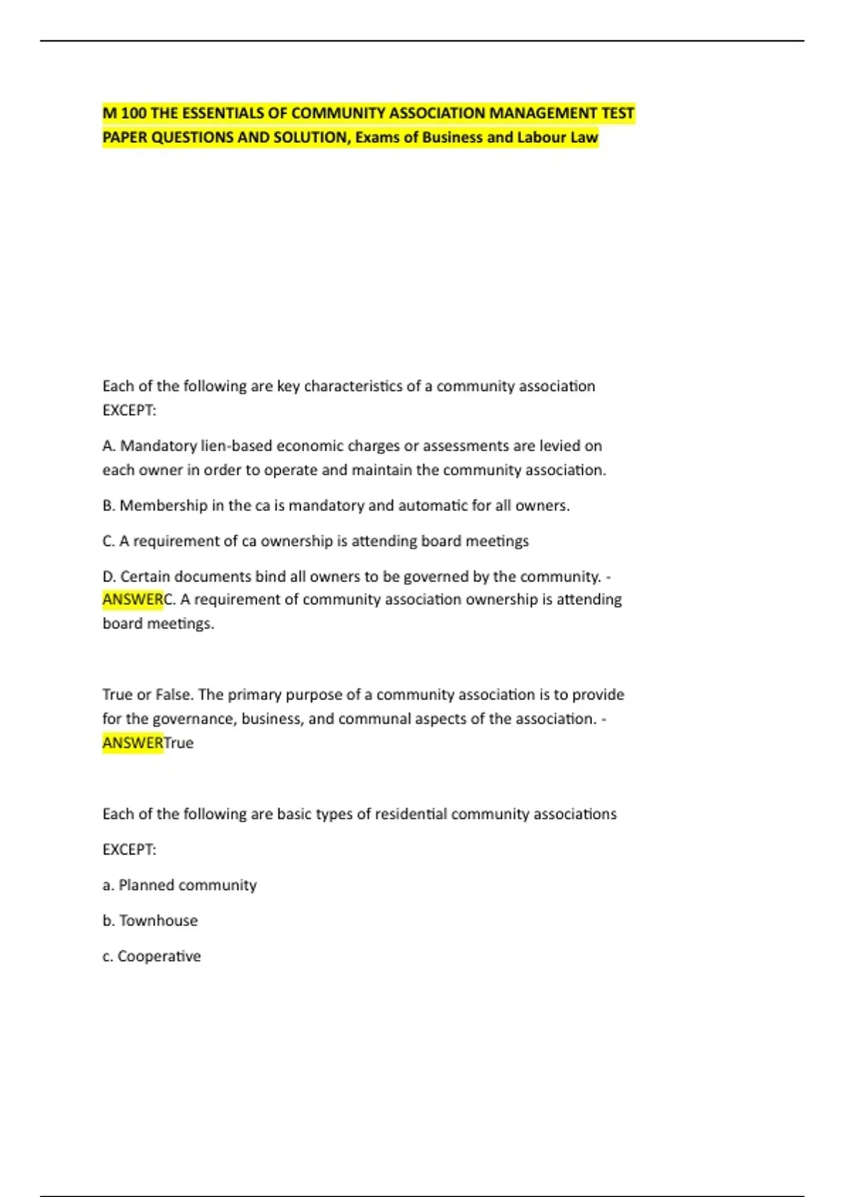 M 100 THE ESSENTIALS OF COMMUNITY ASSOCIATION MANAGEMENT TEST