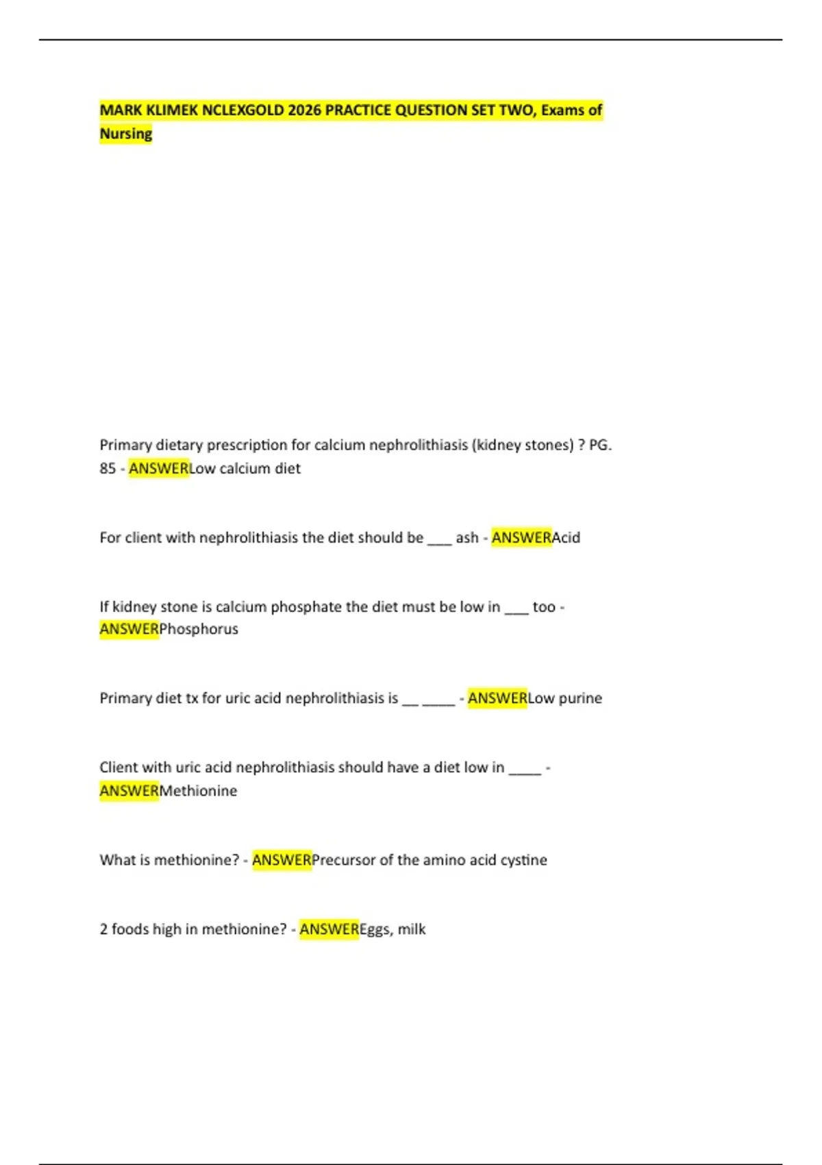 MARK KLIMEK NCLEXGOLD 2026 PRACTICE QUESTION SET TWO, Exams of
