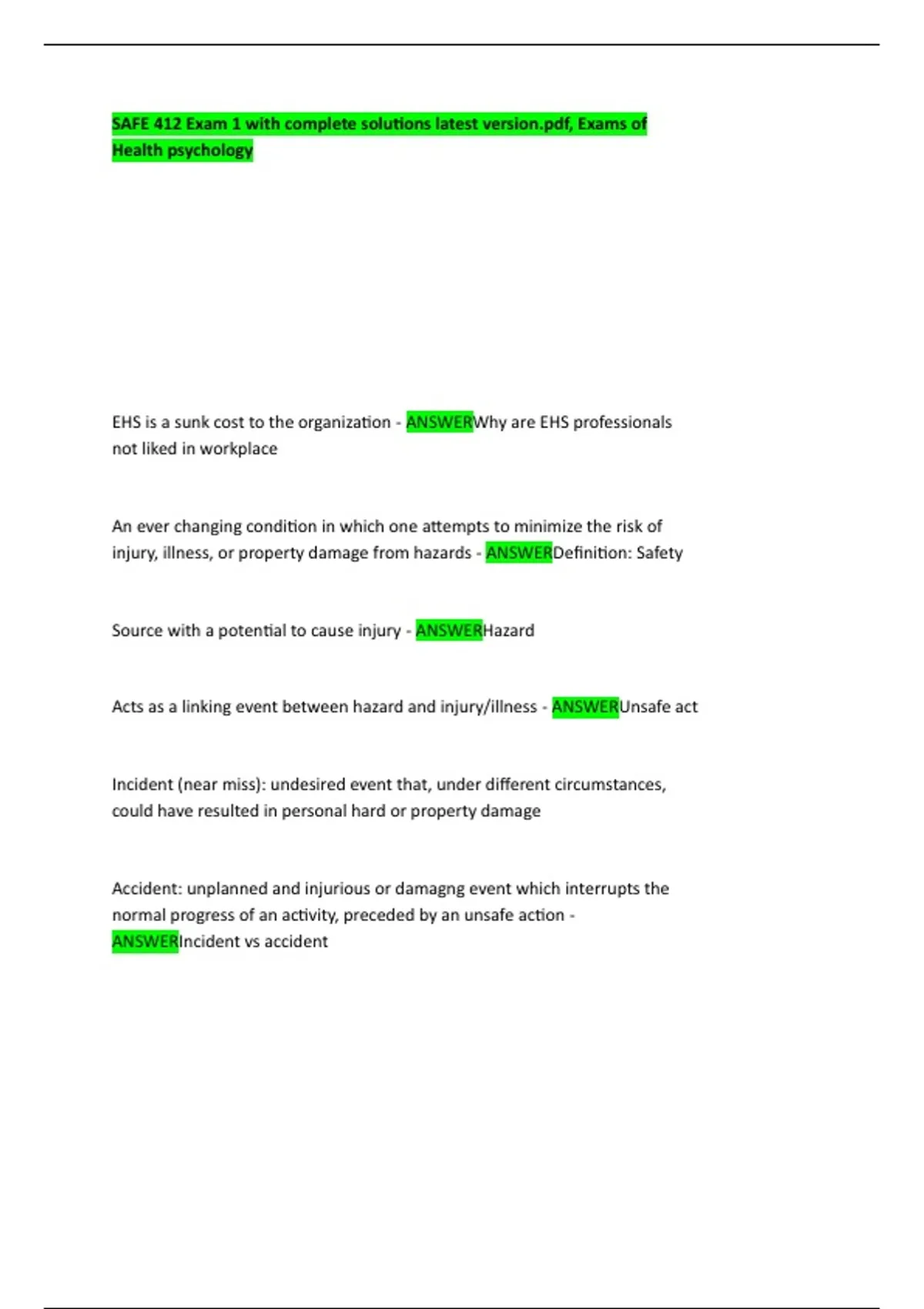SAFE 412 Exam 1 with complete solutions latest version.pdf, Exams of Health psychology