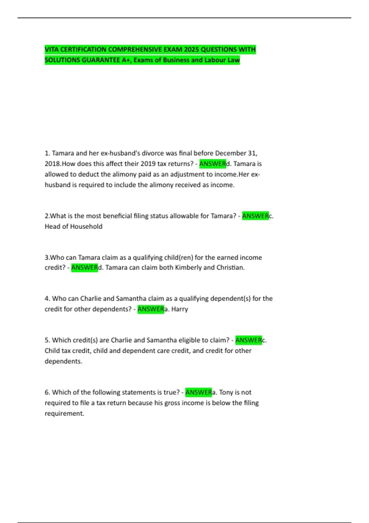 VITA CERTIFICATION COMPREHENSIVE EXAM 2025 QUESTIONS WITH SOLUTIONS GUARANTEE A+, Exams of Business and Labour Law