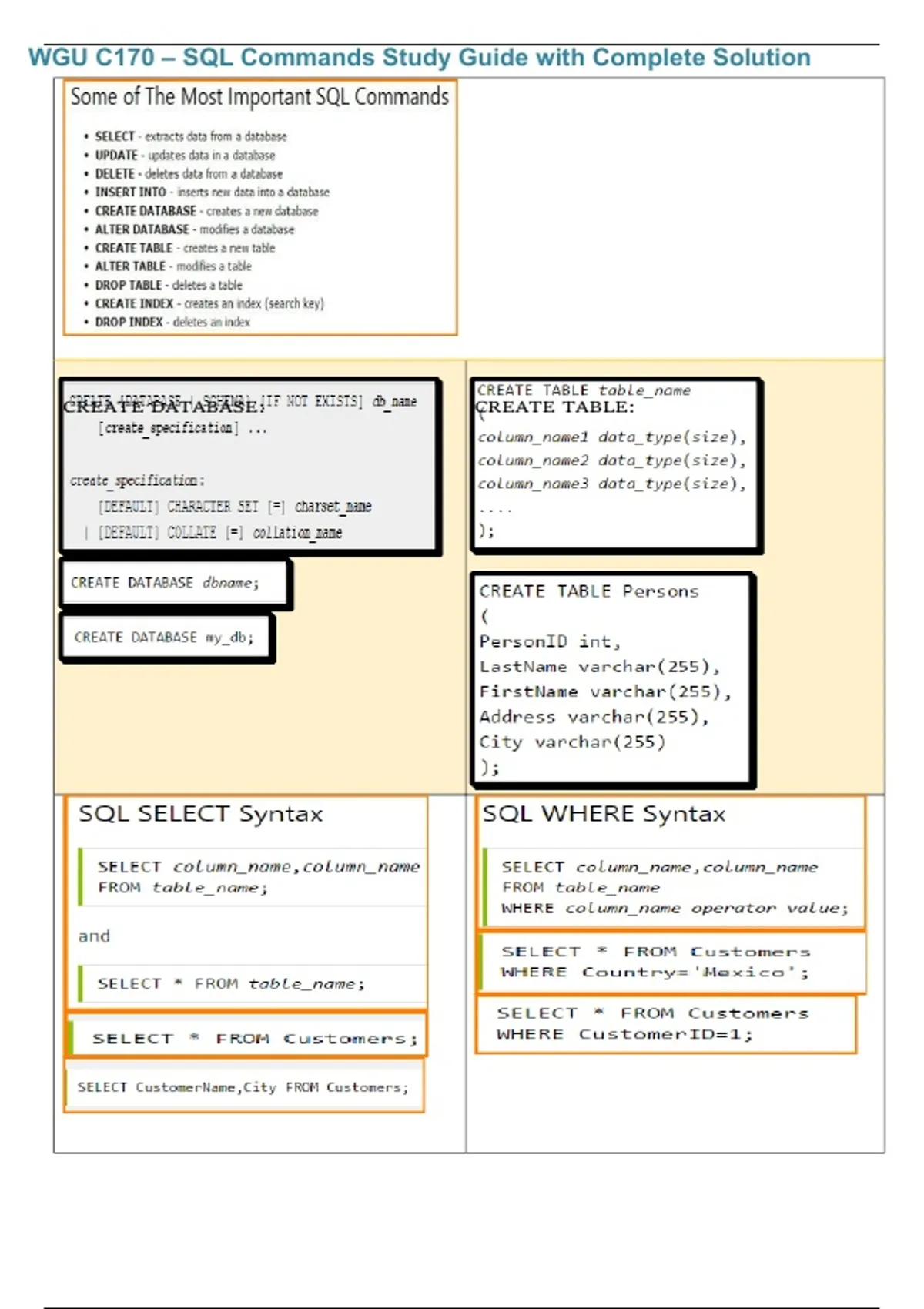 This document provides a complete study guide for WGU C170 focused on SQL commands for the 2026/2027 academic year. It covers core database concepts and practical SQL usage, including data definition language, data manipulation language, queries, joins, subqueries, constraints, and basic relational database design. The material is structured to support hands-on learning and confident preparation for the C170 assessment.