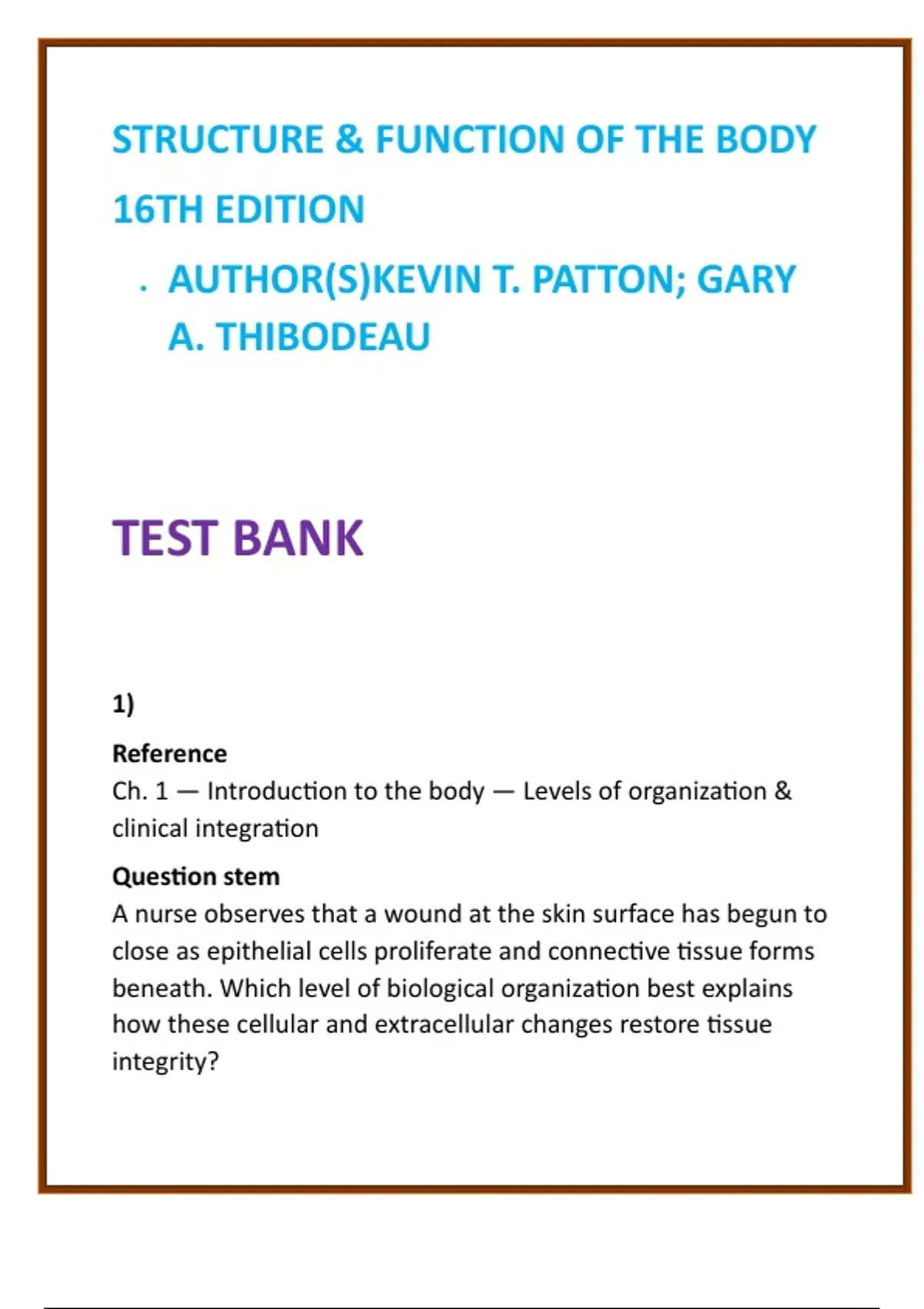 Structure & Function of the Body 16th Edition Test Bank | Patton & Thibodeau Anatomy & Physiology MCQs Study Guide 2) SEO Product Description (200–300 words) Master core Anatomy & Physiology concepts with this comprehensive Structure & Function of the Body, 16th Edition Test Bank by Kevin T. Patton and Gary A. Thibodeau—a globally trusted standard in A&P education. This digital resource delivers full textbook coverage across all units and chapters, making it an essential companion for students preparing for high-stakes A&P exams, nursing prerequisites, and allied health programs. Each chapter includes 20 rigorously developed, exam-aligned multiple-choice questions (MCQs) designed to reinforce structure–function relationships, physiological mechanisms, homeostasis, and early pathophysiology foundations. Questions emphasize clinical application and system integration, helping learners move beyond memorization to true conceptual understanding—exactly what modern Anatomy & Physiology courses require. Every MCQ is paired with clear, concept-based rationales that explain why an answer is correct and why alternatives are not, accelerating knowledge retention and improving exam performance. This test bank saves valuable study time by targeting high-yield concepts most likely to appear on unit exams and cumulative finals. Ideal for use in: Human Anatomy & Physiology I & II Anatomy & Physiology for Nursing & Allied Health Pre-Nursing and Health Sciences Prerequisites Physiology Foundations for Medical, Dental, and Allied Health Programs Key Features: Full-chapter coverage of Structure & Function of the Body (16th Edition) 20 A&P and NCLEX-style MCQs per chapter Verified, physiology-driven rationales Emphasis on system interactions and clinical relevance Digital format for flexible, efficient study This test bank is built for serious learners who want exam readiness, deeper understanding, and confident performance in Anatomy & Physiology. 3) 8 High-Value SEO Keywords structure and function of the body test bank patton and thibodeau anatomy physiology anatomy and physiology test bank mcqs a&p exam questions and answers human anatomy physiology study guide anatomy physiology nursing prerequisites structure function body 16th edition test bank physiology multiple choice questions 4) 10 Optimized Hashtags #AnatomyAndPhysiology #APTestBank #StructureAndFunctionOfTheBody #PattonAndThibodeau #APExamPrep #NursingPrerequisites #AlliedHealthEducation #HealthSciencesStudy #AnatomyPhysiologyMCQs #MedicalAndNursingStudents