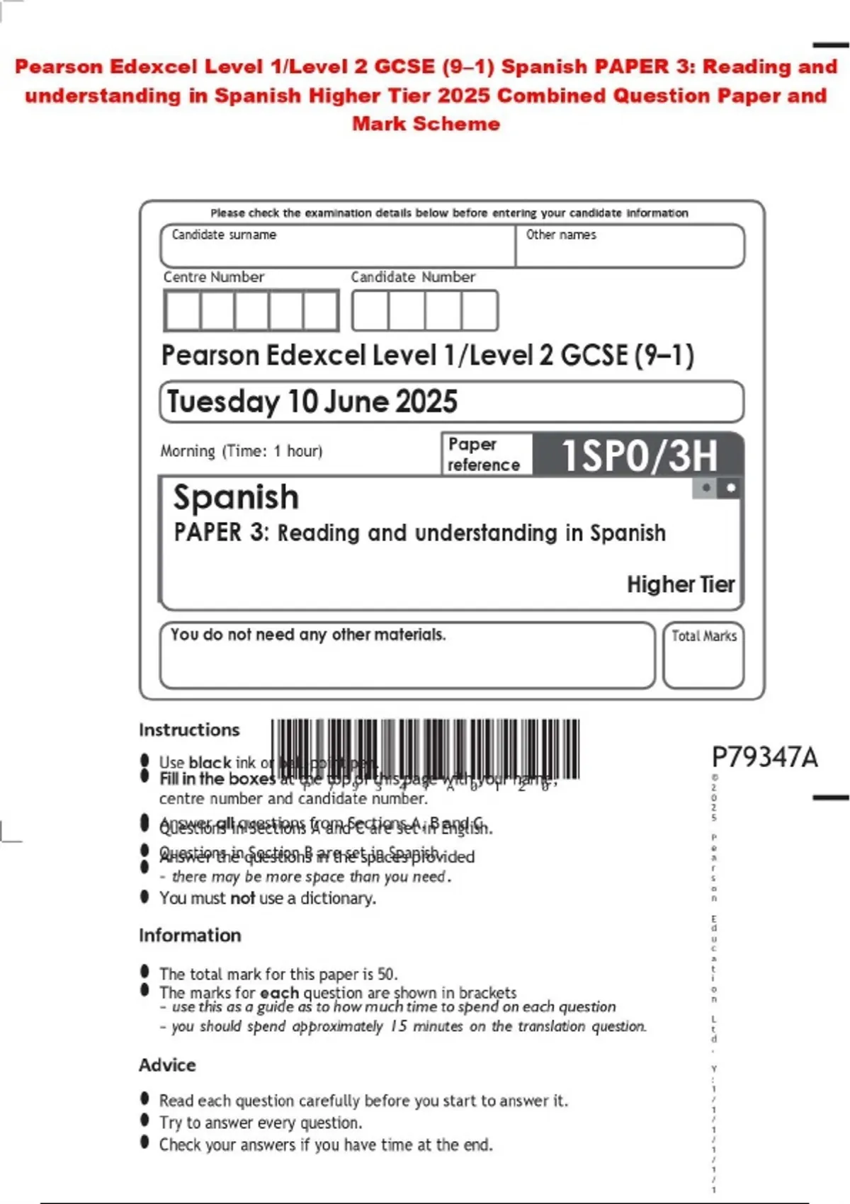 Pearson Edexcel Level 1/Level 2 GCSE (9–1) Spanish PAPER 3: Reading and understanding in Spanish Higher Tier 2025 Combined Question Paper and Mark Scheme