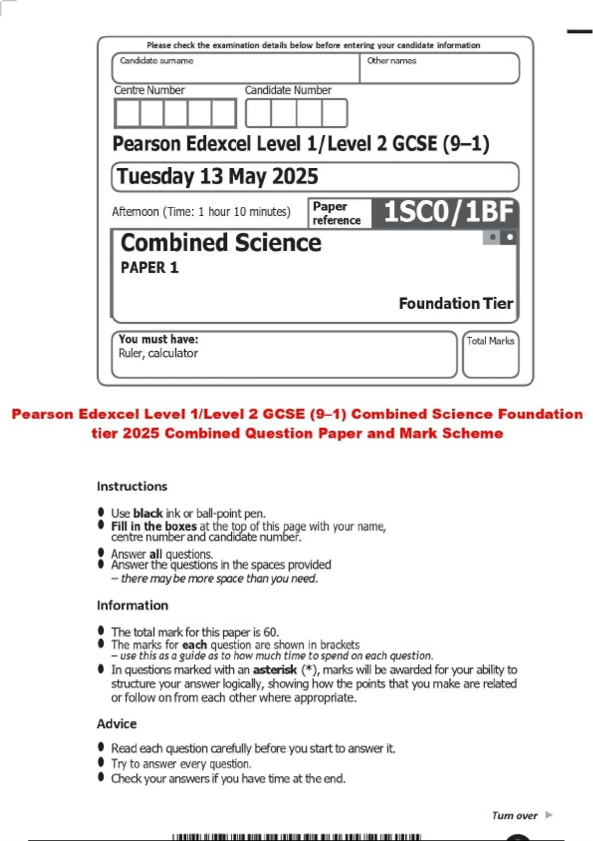 BUNDLE ::: Pearson Edexcel Level 1/Level 2 GCSE (9–1) Combined Science Question Paper with Mark Scheme / 2025
