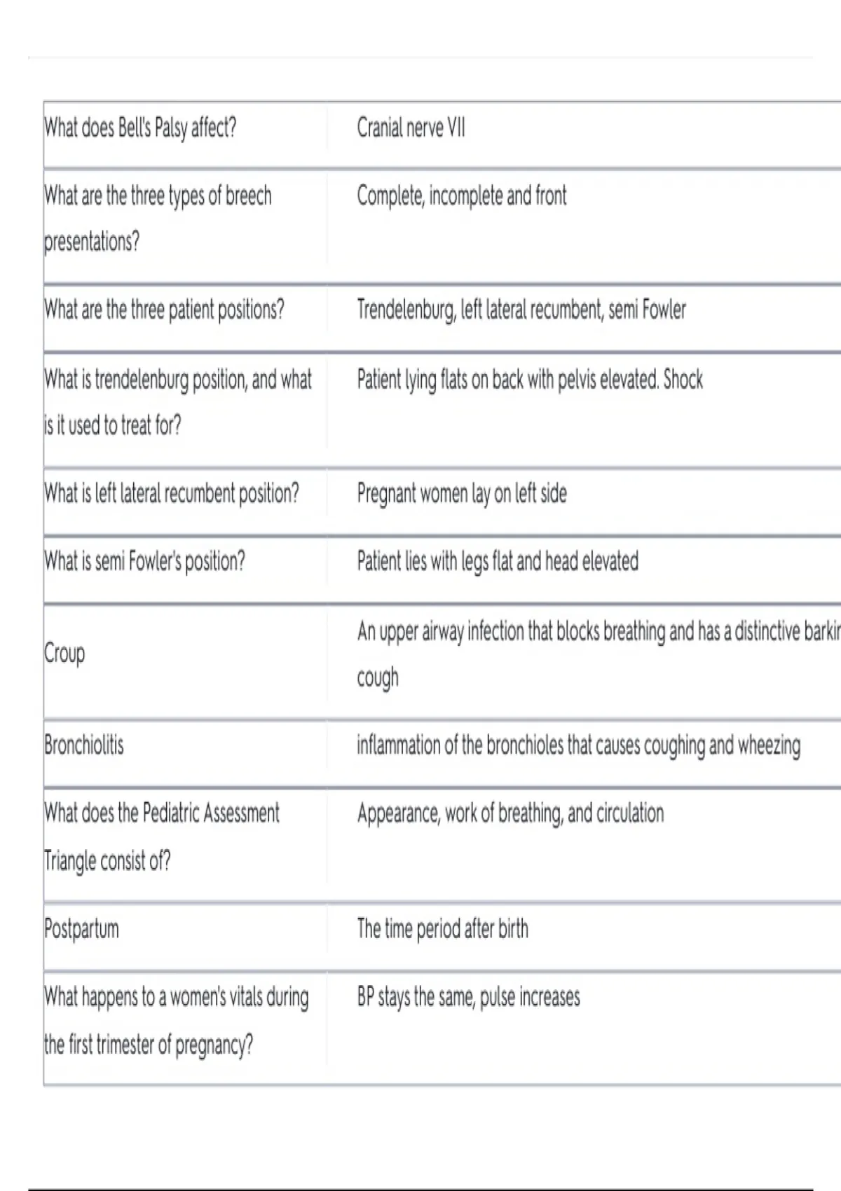What are the three patient positions? Trendelenburg, left lateral recumbent, semi Fowler