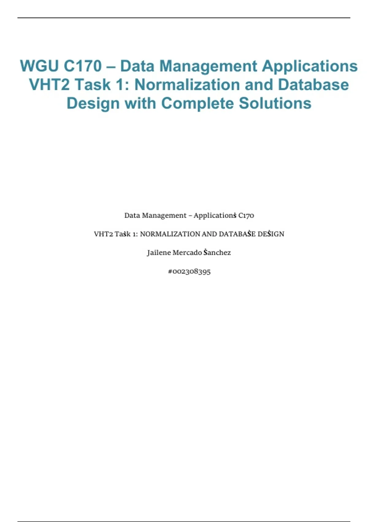 This document provides a complete solution for WGU C170 VHT2 Task 1, focusing on normalization and database design for the 2026/2027 academic year. It walks through identifying entities and attributes, applying normalization rules (1NF–3NF), creating relational schemas, and ensuring data integrity aligned with WGU rubric requirements. The material is designed to support accurate task submission and strong assessment outcomes.