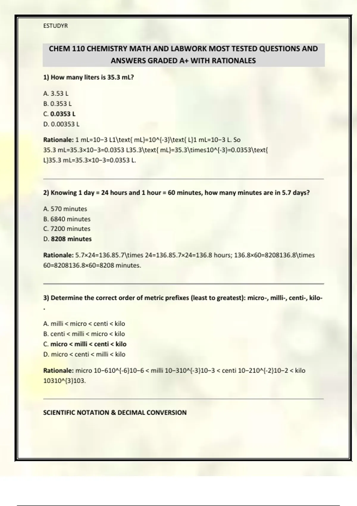 CHEM 110 CHEMISTRY MATH AND LABWORK MOST TESTED QUESTIONS AND