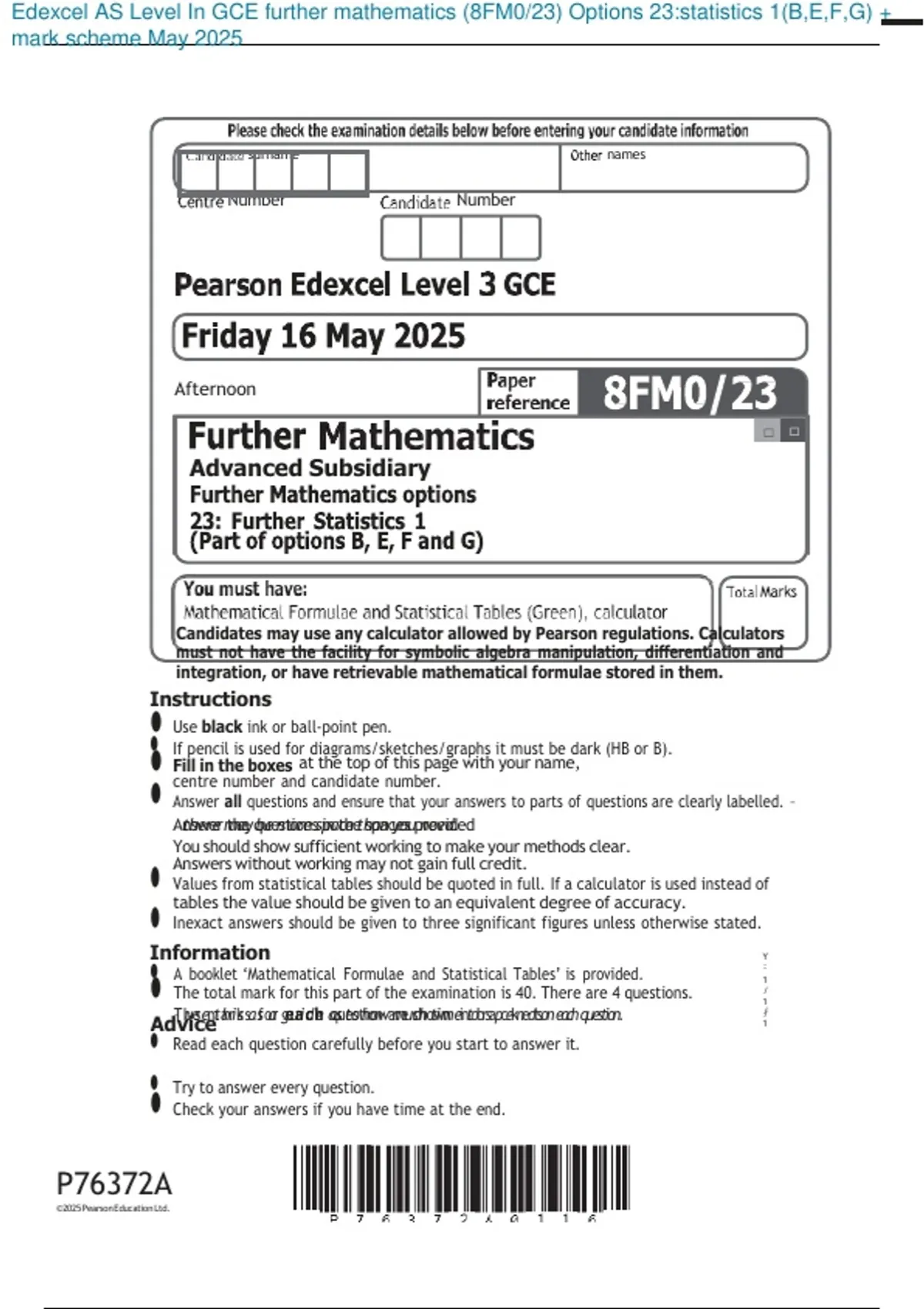 Edexcel AS Level In GCE further mathematics (8FM0/23) Options 23:statistics 1(B,E,F,G) + mark scheme May 2025
