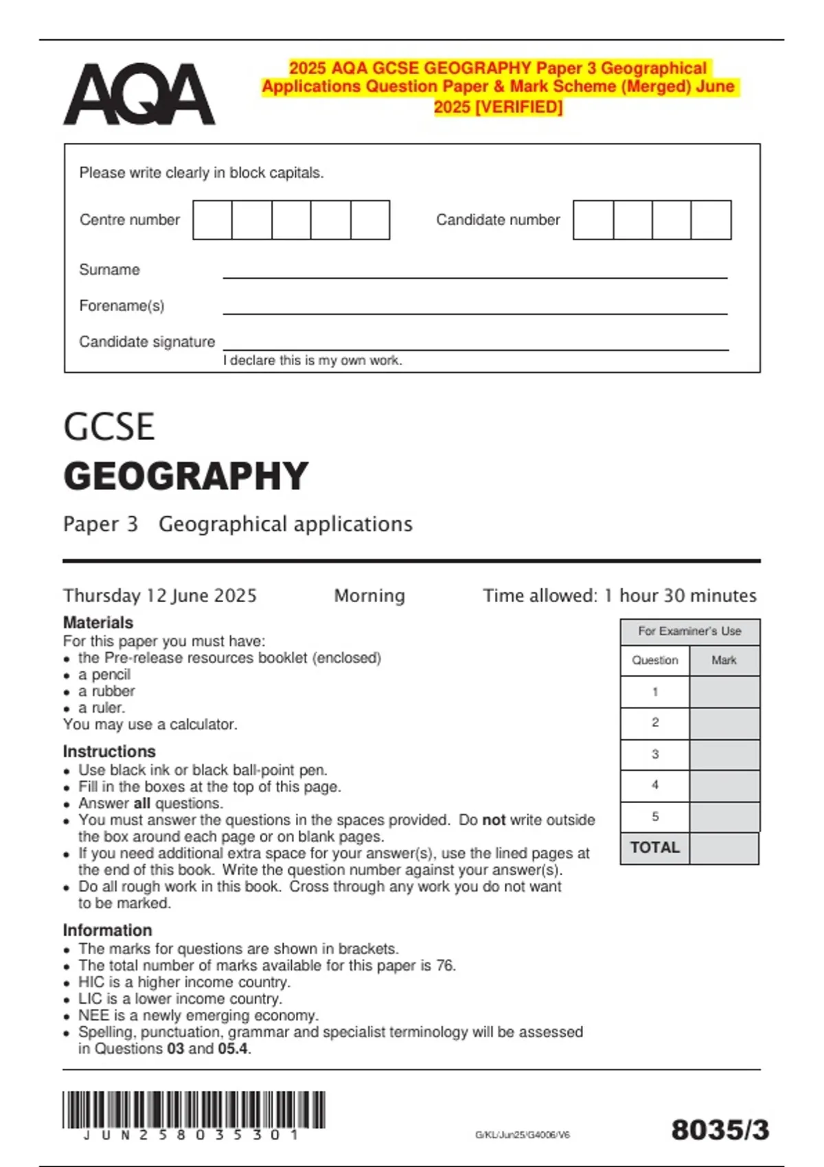 2025 AQA GCSE GEOGRAPHY Paper 3 Geographical Applications Question Paper & Mark Scheme (Merged) June 2025 [VERIFIED] Please write clearly in block capitals. Centre number Surname Forename(s) Candidate signature Candidate number I declare this is my own work. GCSE GEOGRAPHY Paper 3 Geographical applications Thursday 12 June 2025 Materials Morning For this paper you must have:  the Pre-release resources booklet (enclosed)  a pencil  a rubber  a ruler. You may use a calculator. Instructions Time allowed: 1 hour 30 minutes For Examiner’s Use Question Mark 1 2 3  Use black ink or black ball-point pen.  Fill in the boxes at the top of this page.  Answer all questions.  You must answer the questions in the spaces provided. Do not write outside the box around each page or on blank pages.  If you need additional extra space for your answer(s), use the lined pages at the end of this book. Write the question number against your answer(s).  Do all rough work in this book. Cross through any work you do not want to be marked. 4 5 TOTAL Information  The marks for questions are shown in brackets.  The total number of marks available for this paper is 76.  HIC is a higher income country.  LIC is a lower income country.  NEE is a newly emerging economy.  Spelling, punctuation, grammar and specialist terminology will be assessed in Questions 03 and 05.4. 8035/3 G/KL/Jun25/G4006/V6 2 Do not write outside the box G/Jun25/8035/3 For the multiple-choice questions, shade the circle next to the correct answer. CORRECT METHOD WRONG METHODS If you want to change your answer you must cross out your original answer as shown. If you wish to return to an answer previously crossed out, ring the a