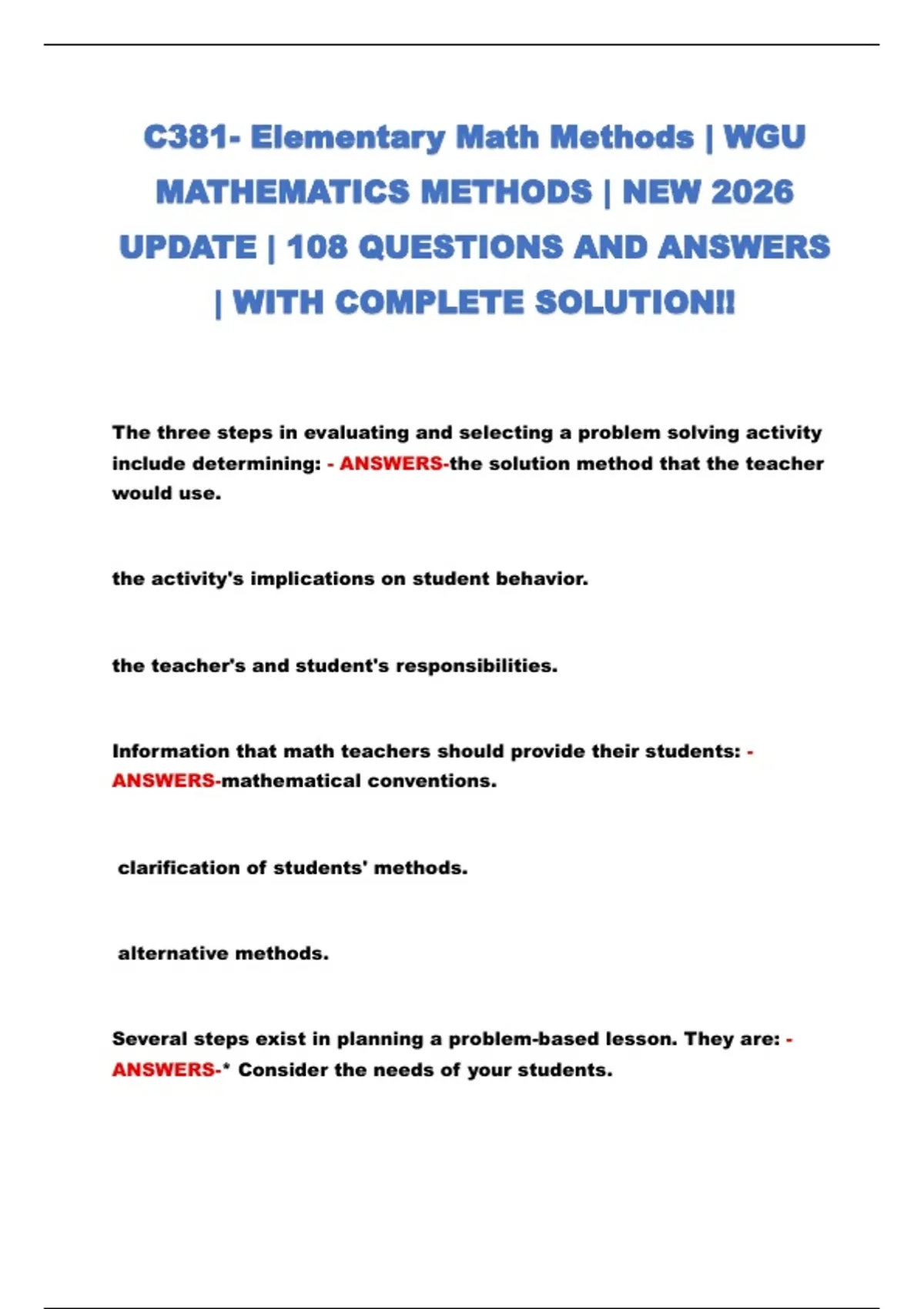 C381- Elementary Math Methods | WGU MATHEMATICS METHODS | NEW 2026 UPDATE | 108 QUESTIONS AND ANSWERS | WITH COMPLETE SOLUTION!!