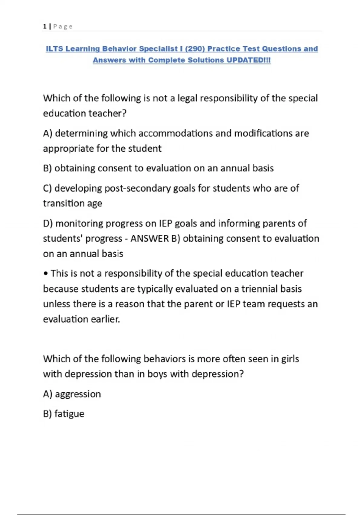 ILTS Learning Behavior Specialist I (290) Practice Test Questions and Answers with Complete Solutions UPDATED!!!