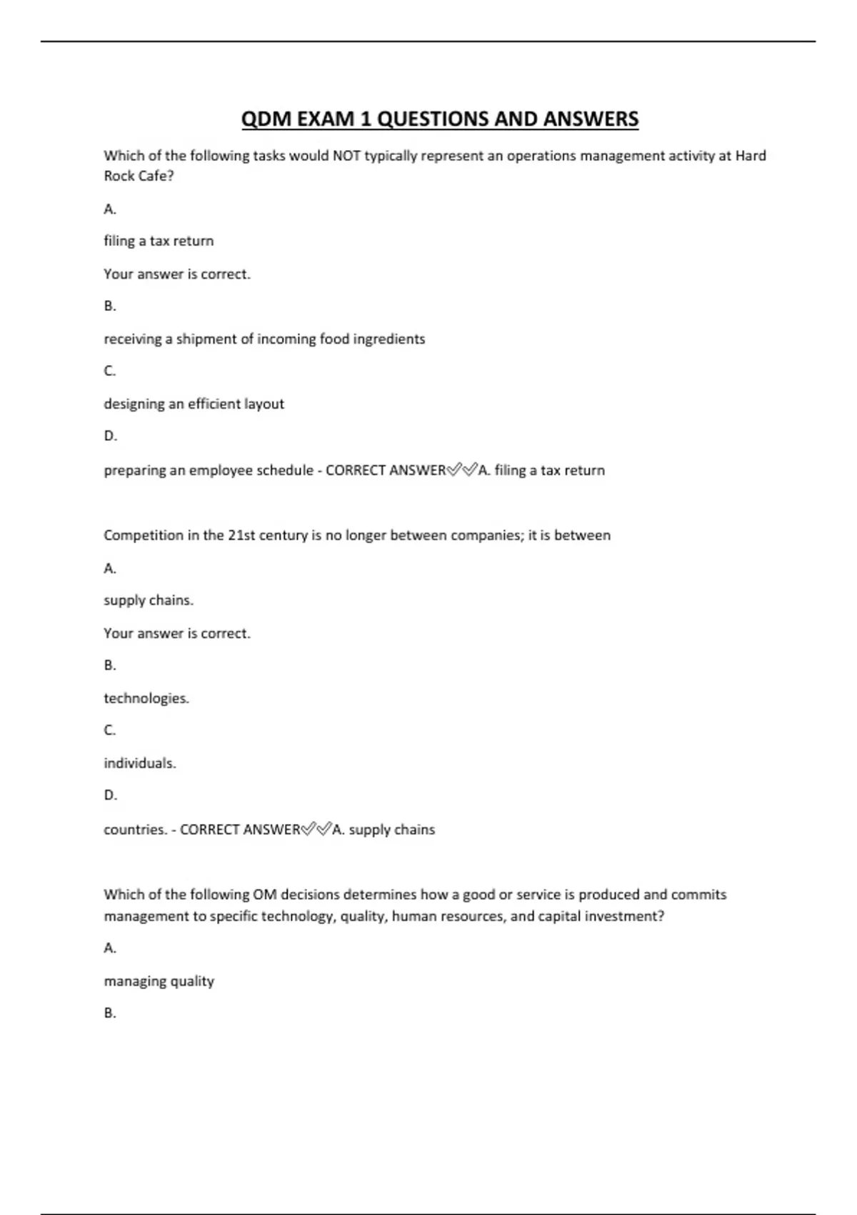 QDM EXAM 1 QUESTIONS AND ANSWERS Which of the following tasks would NOT typically represent an operations management activity at Hard Rock Cafe? A. filing a tax return Your answer is correct. B. receiving a shipment of incoming food ingredients C. designing an efficient layout D. preparing an employee schedule - CORRECT ANSWERA. filing a tax return