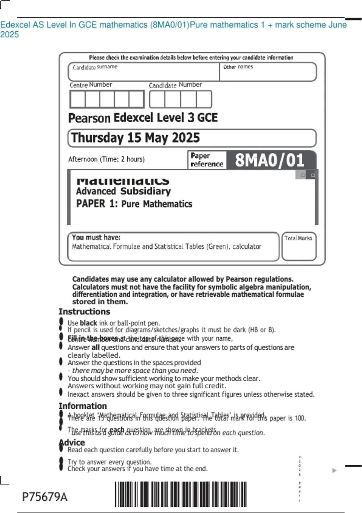Edexcel AS Level In GCE mathematics (8MA0/01)Pure mathematics 1 + mark scheme June 2025
