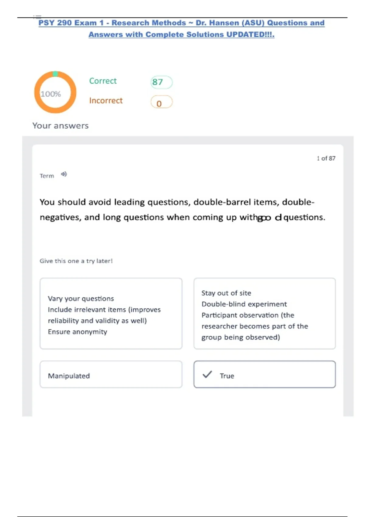 PSY 290 Exam 1 - Research Methods - Dr. Hansen (ASU) Questions and Answers with Complete Solutions UPDATED!!!