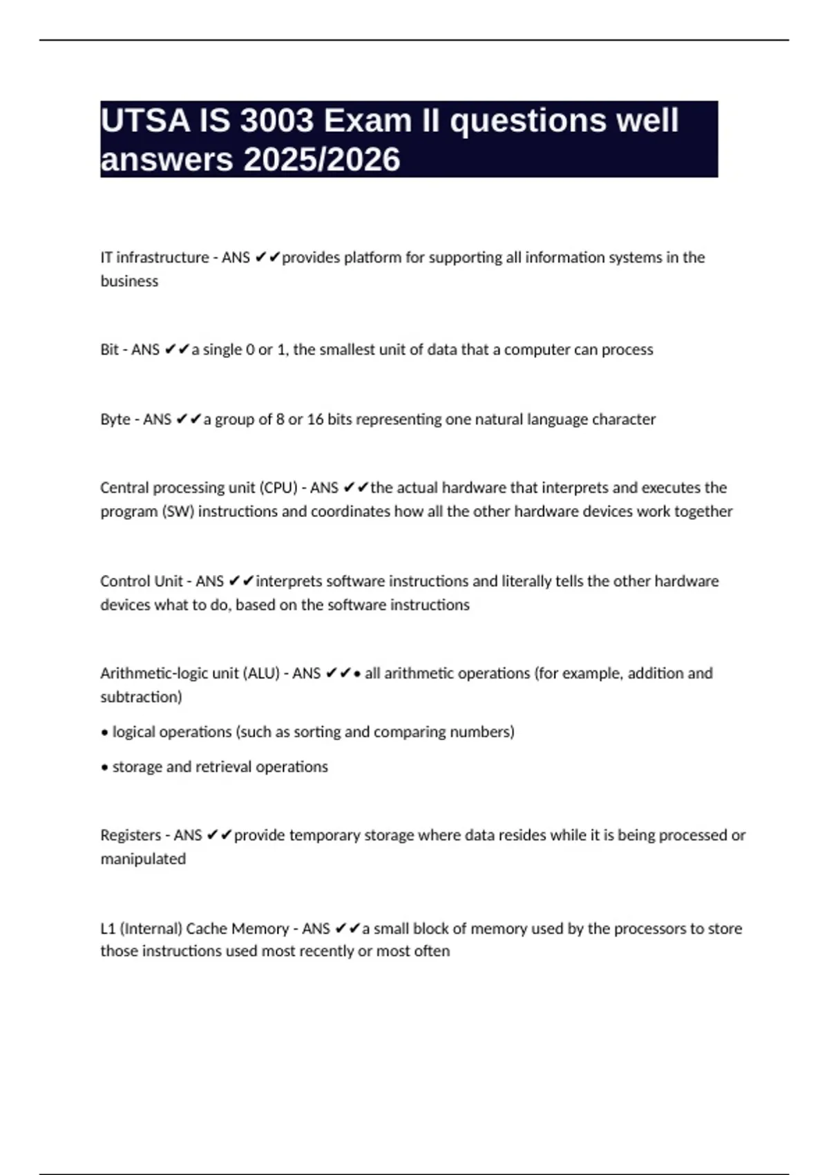 Central processing unit (CPU) - ANS ✔✔the actual hardware that interprets and executes the