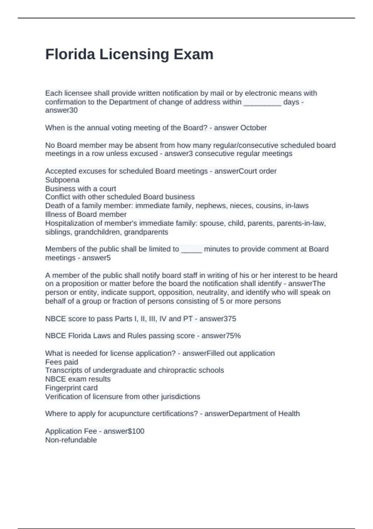Florida Licensing Exam Questions and Answers