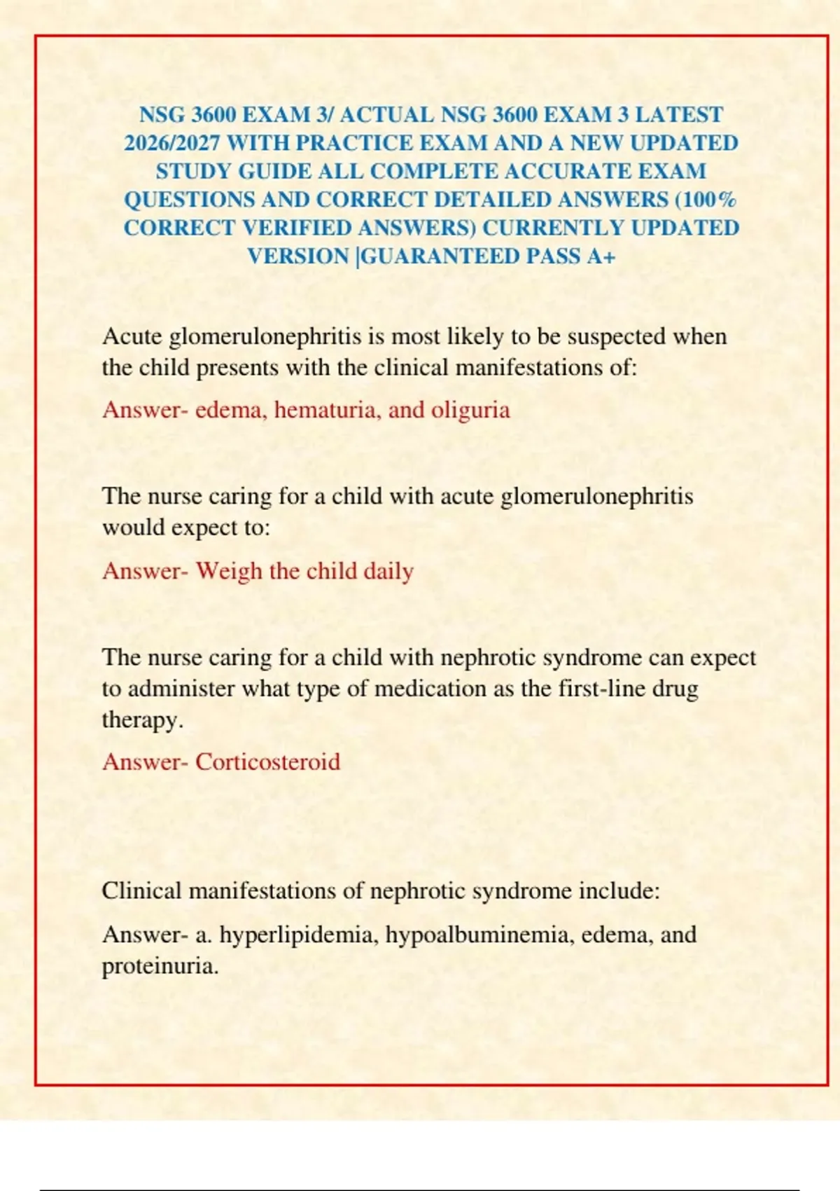 NSG 3600 EXAM 3/ ACTUAL NSG 3600 EXAM 3 LATEST 2026/2027 WITH PRACTICE EXAM AND A NEW UPDATED STUDY GUIDE ALL COMPLETE ACCURATE EXAM QUESTIONS AND CORRECT DETAILED ANSWERS (100% CORRECT VERIFIED ANSWERS) CURRENTLY UPDATED VERSION |GUARANTEED PASS A+