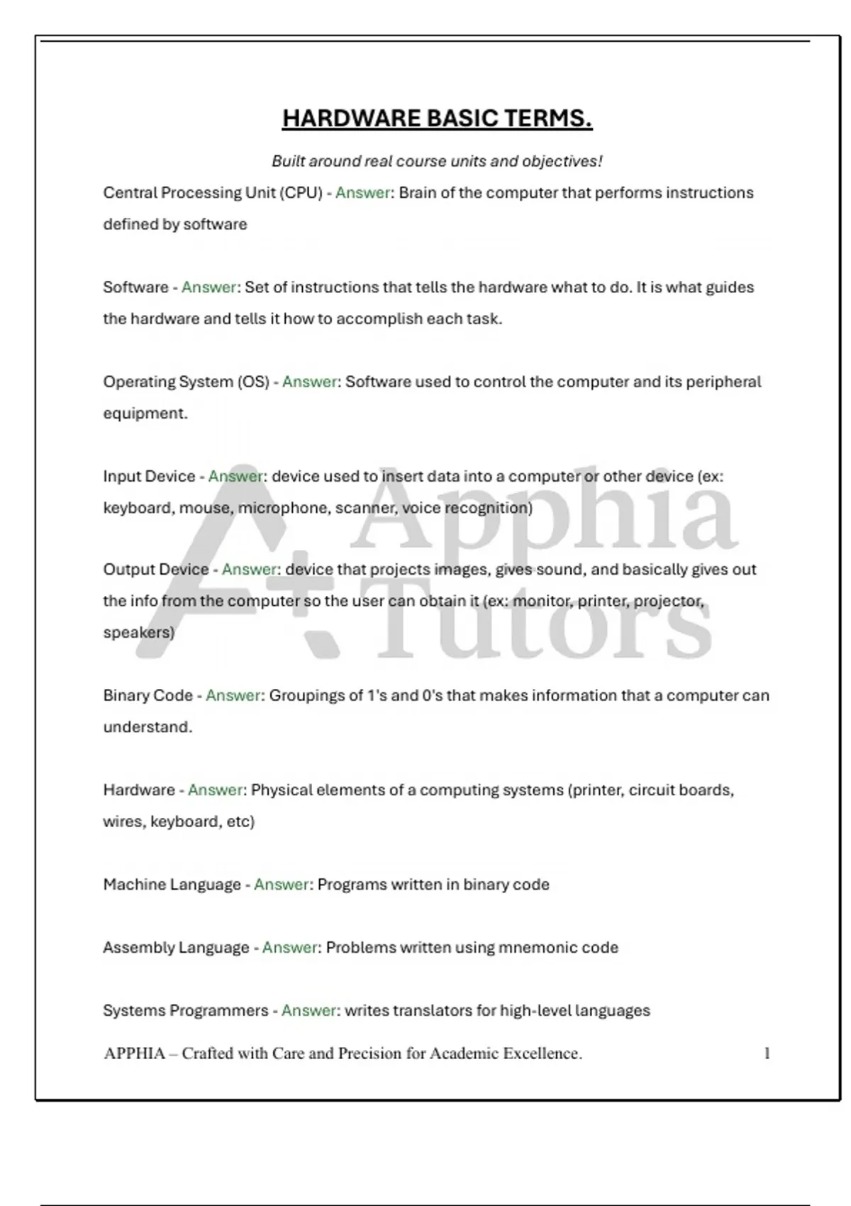 Hardware - Answer: Physical elements of a computing systems (printer, circuit boards,
