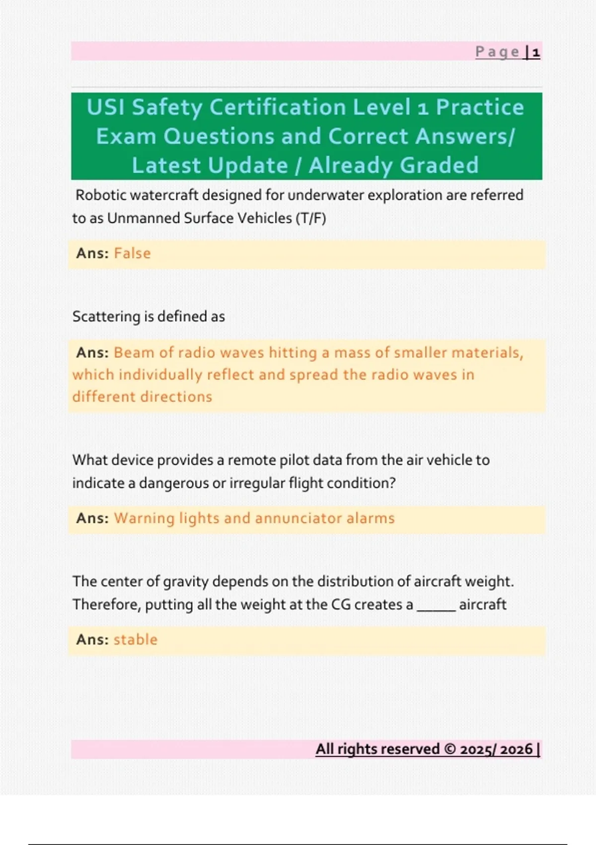 USI Safety Certification Level 1 Practice Exam Questions and Correct Answers/ Latest Update / Already Graded