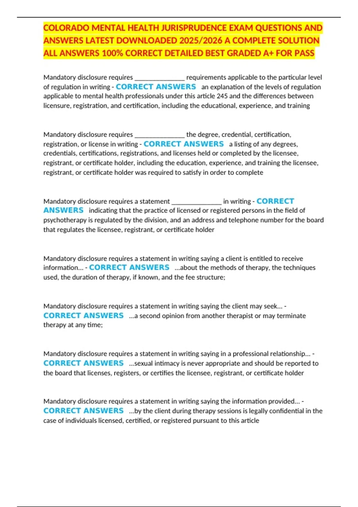 COLORADO MENTAL HEALTH JURISPRUDENCE EXAM QUESTIONS AND ANSWERS LATEST DOWNLOADED 2025/2026 A COMPLETE SOLUTION ALL ANSWERS 100% CORRECT DETAILED BEST GRADED A+ FOR PASS