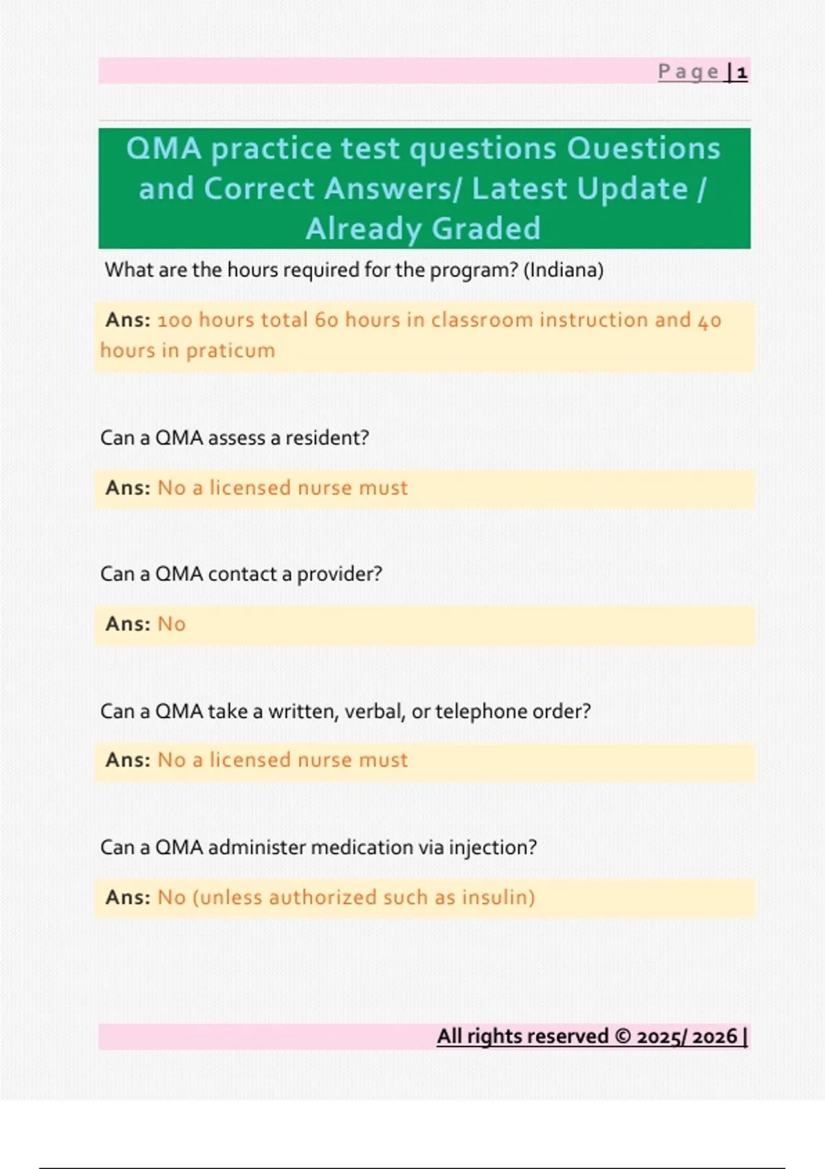 What are the hours required for the program? (Indiana) Ans: 100 hours total 60 hours in classroom instruction and 40 hours in praticum Can a QMA assess a resident? Ans: No a licensed nurse must Can a QMA contact a provider? Ans: No Can a QMA take a written, verbal, or telephone order? Ans: No a licensed nurse must Can a QMA administer medication via injection? Ans: No (unless authorized such as insulin) All rights reserved © 2025/ 2026 | Page | 2 All rights reserved © 2025/ 2026 | Can a QMA administer medicine of inhalation other than a metered dose inhaler? Ans: No Can a QMA administer medication via a nasogastric tube? Ans: No they are not permitted mess with NG tubes under any circumstances Can a QMA administer medications through a G-tube and J-tube? Ans: Yes can qma administrator oxygen in an emergency Ans: yes then notify nurse Name an example of the QMAs scope of practice Ans: - observe reactions to medications and report to nurse - measure and document vital signs prior to giving medications - administer medications - initiate O2 in emergency -alter medications - count, administer, & count controlled substances Page | 3 All rights reserved © 2025/ 2026 | - administer medications via G-Tube or J- Tube - administer PRN medications - apply a topical medications to minor skin injury - administer medications via metered dose inhaler - conduct hemoccult testing -