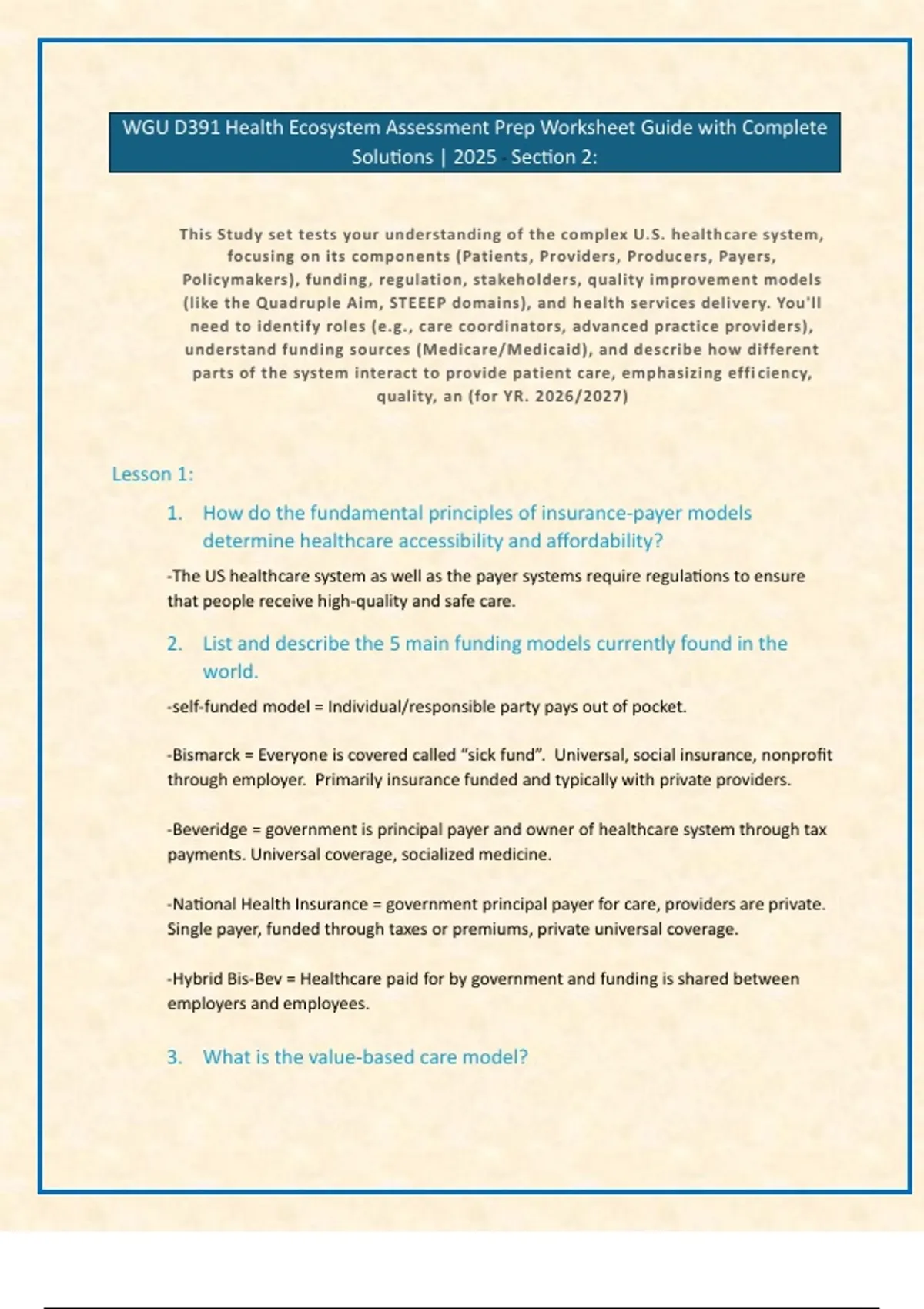 WGU D391 Health Ecosystem Assessment Prep Worksheet Guide with Complete Solutions | 2025 - Section 2: This Study set tests your understanding of the complex U.S. healthcare system, focusing on its components (Patients, Providers, Producers, Payers, Policymakers), funding, regulation, stakeholders, quality improvement models (like the Quadruple Aim, STEEEP domains), and health services delivery. You'll need to identify roles (e.g., care coordinators, advanced practice providers), understand funding sources (Medicare/Medicaid), and describe how different parts of the system interact to provide patient care, emphasizing efficiency, quality, an (for YR. 2026/2027)